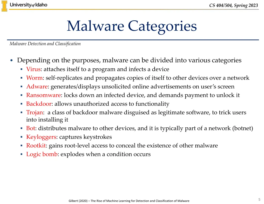 CS 404/504, Spring 2023 Malware Categories Malware Detection and Classification Depending on the purposes, malware can be divided into various categories Virus: attaches itself to a program and infects a device Worm: self-replicates and propagates copies of itself to other devices over a network Adware: generates/displays unsolicited online advertisements on user s screen Ransomware: locks down an infected device, and demands payment to unlock it Backdoor: allows unauthorized access to functionality Trojan: a class of backdoor malware disguised as legitimate software, to trick users into installing it Bot: distributes malware to other devices, and it is typically part of a network (botnet) Keyloggers: captures keystrokes Rootkit: gains root-level access to conceal the existence of other malware Logic bomb: explodes when a condition occurs 5 Gilbert (2020) The Rise of Machine Learning for Detection and Classification of Malware
