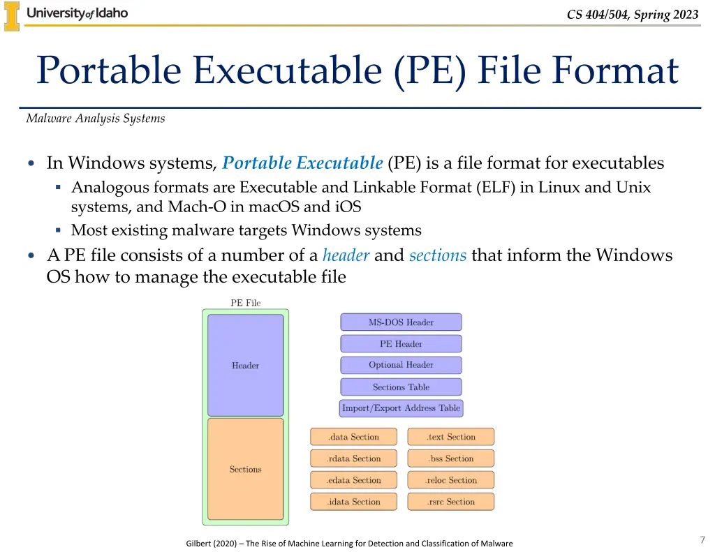 CS 404/504, Spring 2023 Portable Executable (PE) File Format Malware Analysis Systems In Windows systems, Portable Executable (PE) is a file format for executables Analogous formats are Executable and Linkable Format (ELF) in Linux and Unix systems, and Mach-O in macOS and iOS Most existing malware targets Windows systems A PE file consists of a number of a header and sections that inform the Windows OS how to manage the executable file 7 Gilbert (2020) The Rise of Machine Learning for Detection and Classification of Malware