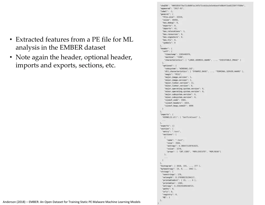 Extracted features from a PE file for ML analysis in the EMBER dataset Note again the header, optional header, imports and exports, sections, etc. Anderson (2018) EMBER: An Open Dataset for Training Static PE Malware Machine Learning Models