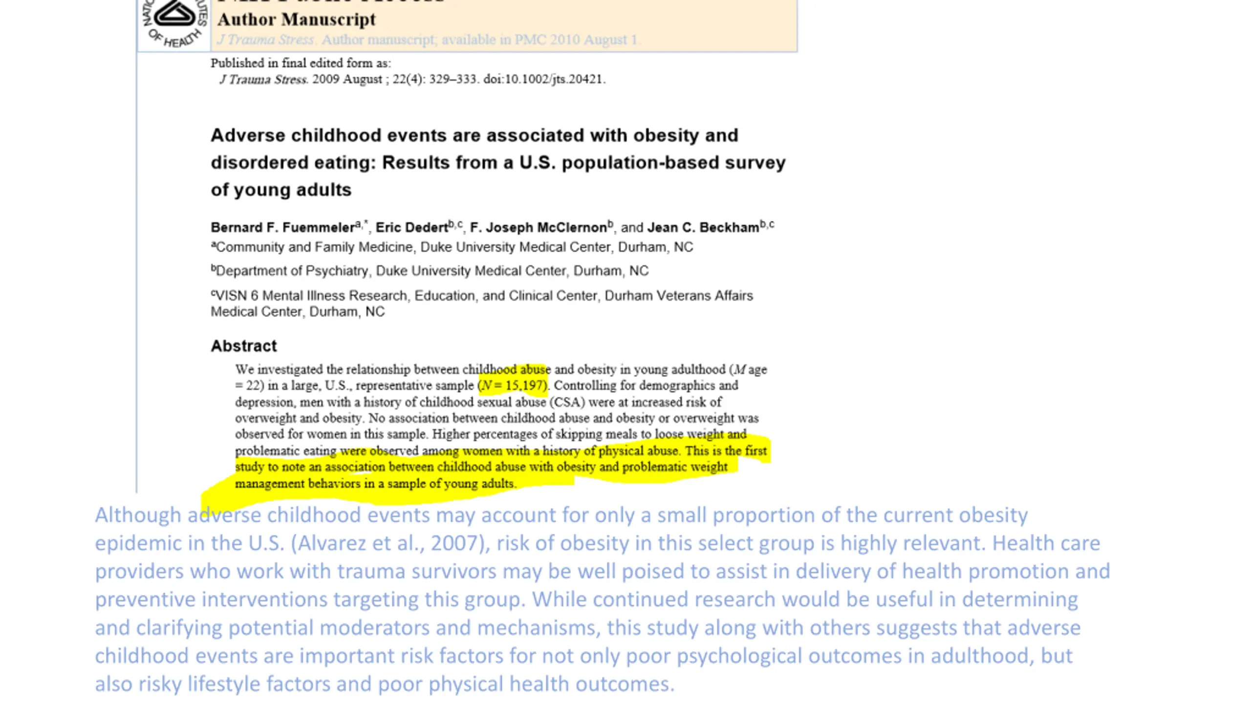Although adverse childhood events may account for only a small proportion of the current obesity epidemic in the U.S. (Alvarez et al., 2007), risk of obesity in this select group is highly relevant. Health care providers who work with trauma survivors may be well poised to assist in delivery of health promotion and preventive interventions targeting this group. While continued research would be useful in determining and clarifying potential moderators and mechanisms, this study along with others suggests that adverse childhood events are important risk factors for not only poor psychological outcomes in adulthood, but also risky lifestyle factors and poor physical health outcomes.