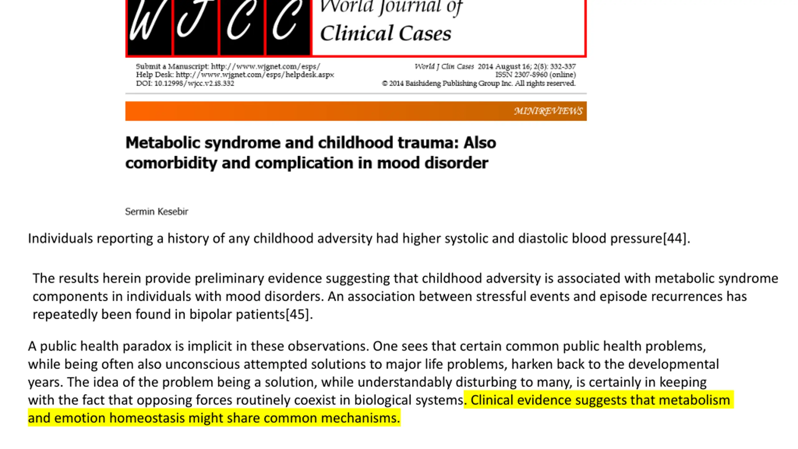 Individuals reporting a history of any childhood adversity had higher systolic and diastolic blood pressure[44]. The results herein provide preliminary evidence suggesting that childhood adversity is associated with metabolic syndrome components in individuals with mood disorders. An association between stressful events and episode recurrences has repeatedly been found in bipolar patients[45]. A public health paradox is implicit in these observations. One sees that certain common public health problems, while being often also unconscious attempted solutions to major life problems, harken back to the developmental years. The idea of the problem being a solution, while understandably disturbing to many, is certainly in keeping with the fact that opposing forces routinely coexist in biological systems. Clinical evidence suggests that metabolism and emotion homeostasis might share common mechanisms.