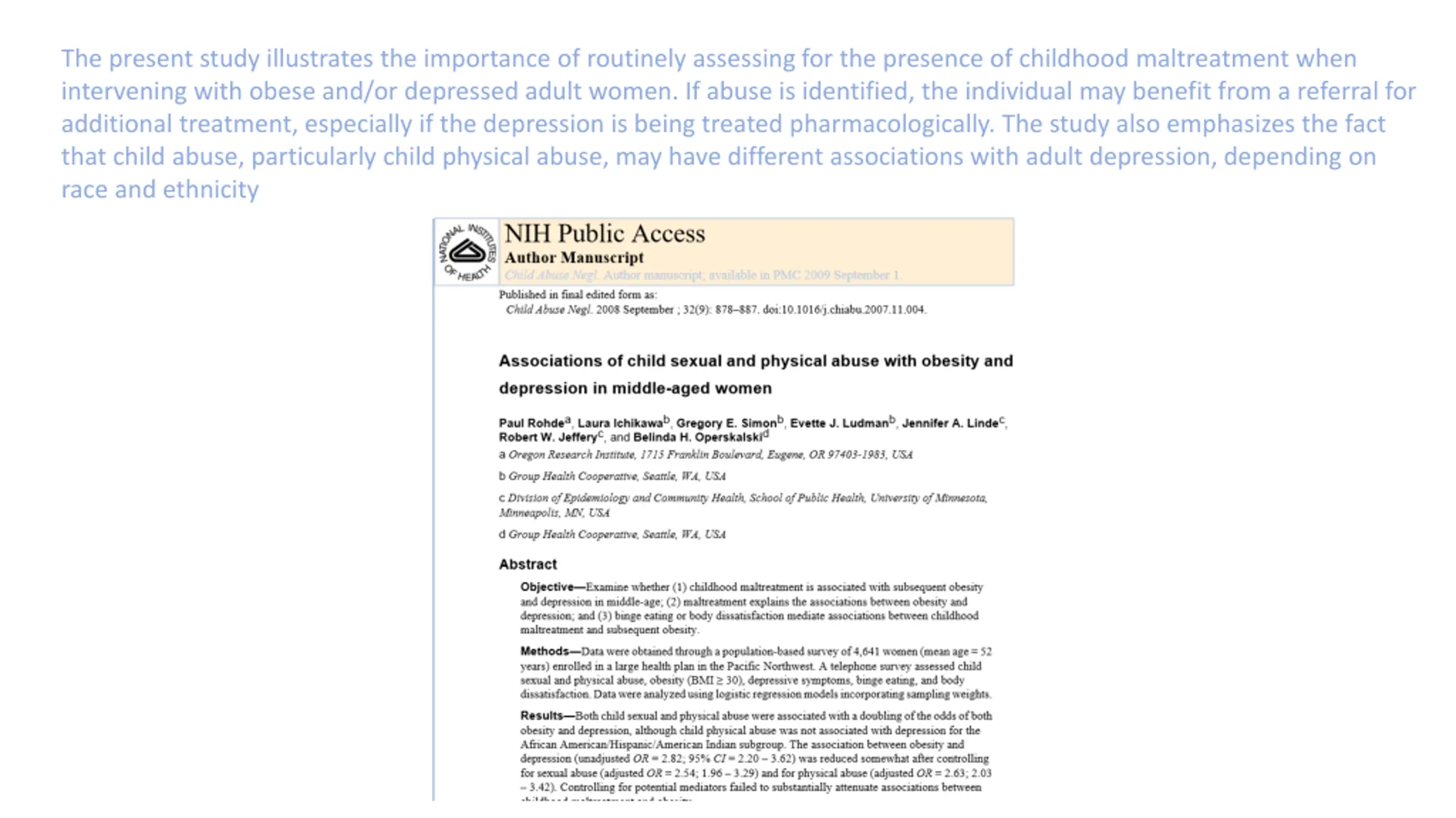 The present study illustrates the importance of routinely assessing for the presence of childhood maltreatment when intervening with obese and/or depressed adult women. If abuse is identified, the individual may benefit from a referral for additional treatment, especially if the depression is being treated pharmacologically. The study also emphasizes the fact that child abuse, particularly child physical abuse, may have different associations with adult depression, depending on race and ethnicity