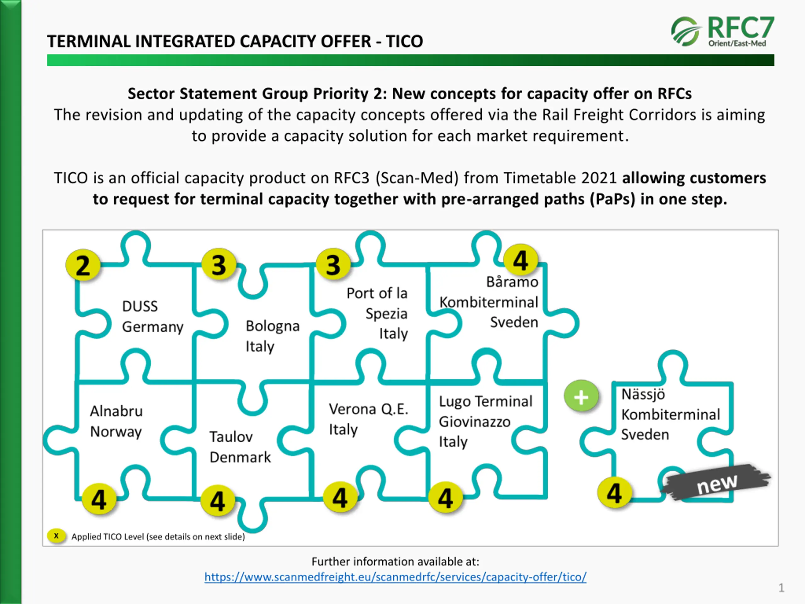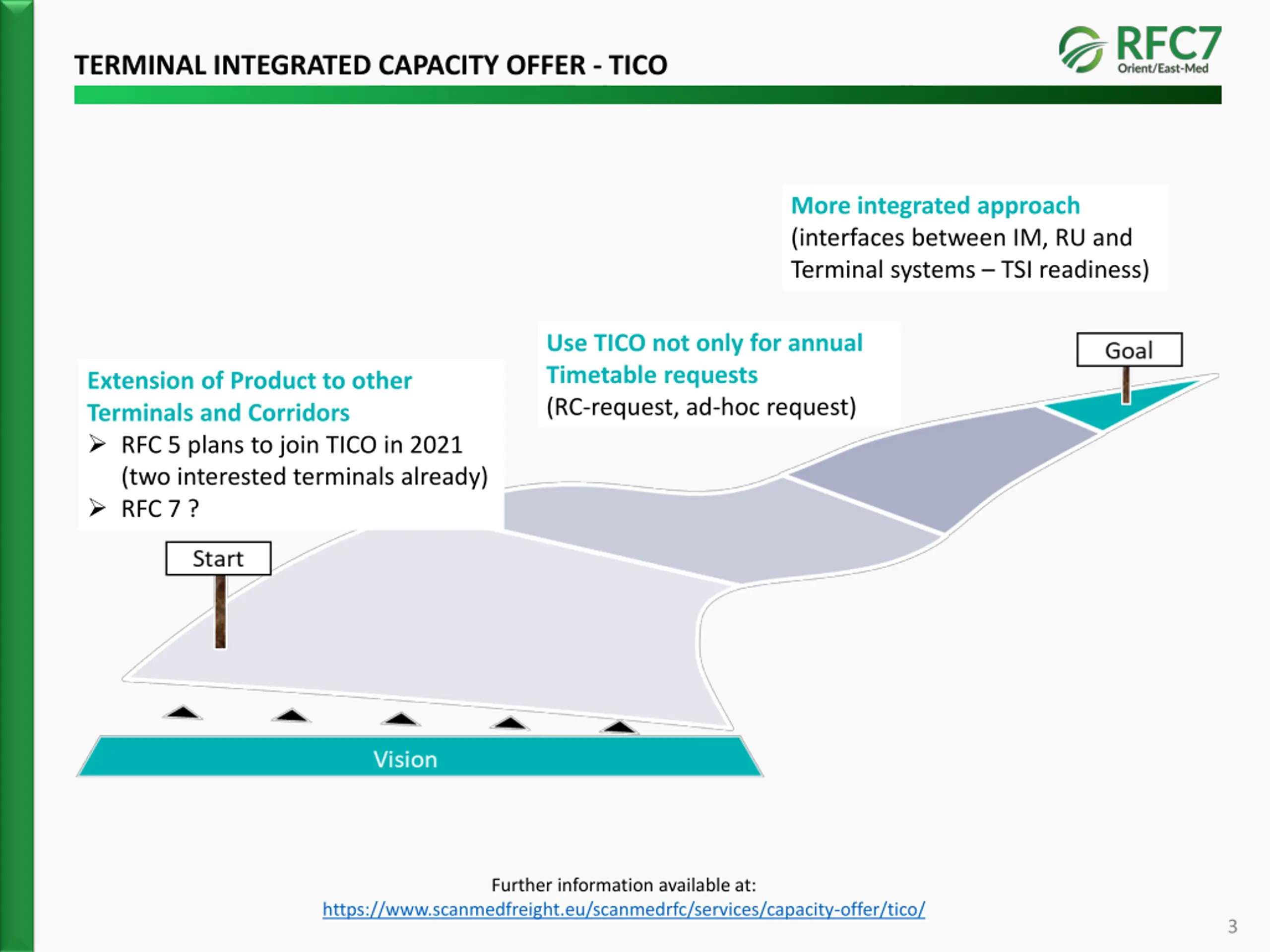TERMINAL INTEGRATED CAPACITY OFFER - TICO C-OSS as facilitator of information exchange By the Beginning of July, the C-OSS forwards to the Terminals the train information on Draft TT for the trains that can be expected in Terminals with permission by the applicant. 1 C-OSS as common Post-Box Applicants can place requests for Terminal Capacity in one step, together with the PaP requests. The C-OSS acts as a common Post-Box for both requests for PaPs and for Terminal Capacity. Pre-Booking and Allocation of the Terminal Capacity is still conducted by the concerned Terminal. 2 Publication of Free Terminal Slots C-OSS publishes free Terminal Slots (no preliminary coordination with the PaP times) in the PaP Catalogue. Once an Applicant has applied for a published slot, the request for the Terminal Capacity will be forwarded to the Terminals for pre-booking and allocation. 3 Publication of Coordinated Terminal Slots and integrated offer C-OSS publishes in the PaP Catalogue Terminal Slots which were coordinated with the PaP times. Once an Applicant applied for a PaP and a coordinated Terminal Slot, the C-OSS decides which Terminal Slot is to be pre-booked to which applicant. Final Allocation of the Terminal Capacity is still conducted by the concerned Terminal. 4 Further information available at: https://www.scanmedfreight.eu/scanmedrfc/services/capacity-offer/tico/ 2