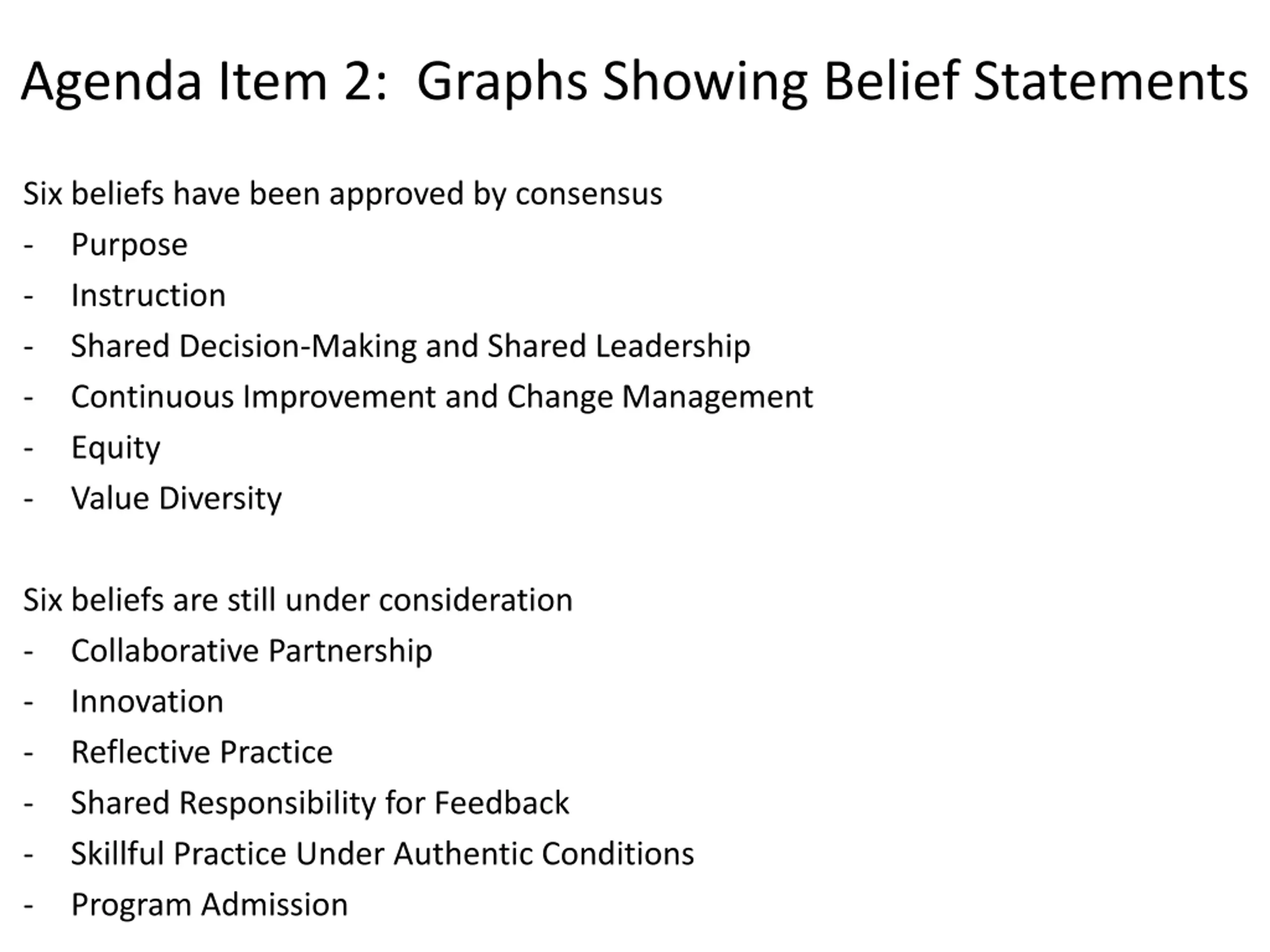 Agenda Item 2: Graphs Showing Belief Statements Six beliefs have been approved by consensus - Purpose - Instruction - Shared Decision-Making and Shared Leadership - Continuous Improvement and Change Management - Equity - Value Diversity Six beliefs are still under consideration - Collaborative Partnership - Innovation - Reflective Practice - Shared Responsibility for Feedback - Skillful Practice Under Authentic Conditions - Program Admission
