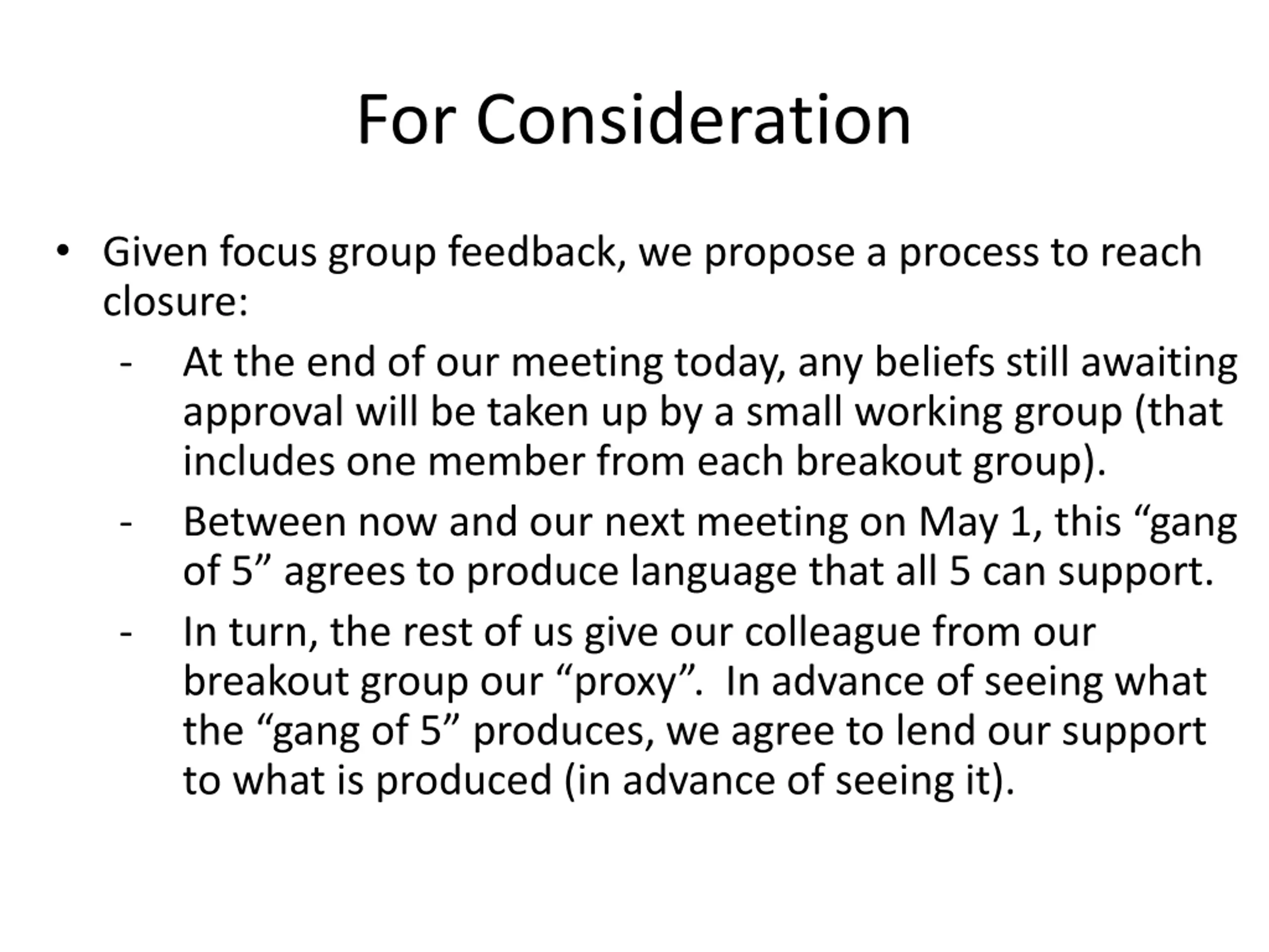 For Consideration Given focus group feedback, we propose a process to reach closure: - At the end of our meeting today, any beliefs still awaiting approval will be taken up by a small working group (that includes one member from each breakout group). - Between now and our next meeting on May 1, this gang of 5 agrees to produce language that all 5 can support. - In turn, the rest of us give our colleague from our breakout group our proxy . In advance of seeing what the gang of 5 produces, we agree to lend our support to what is produced (in advance of seeing it).