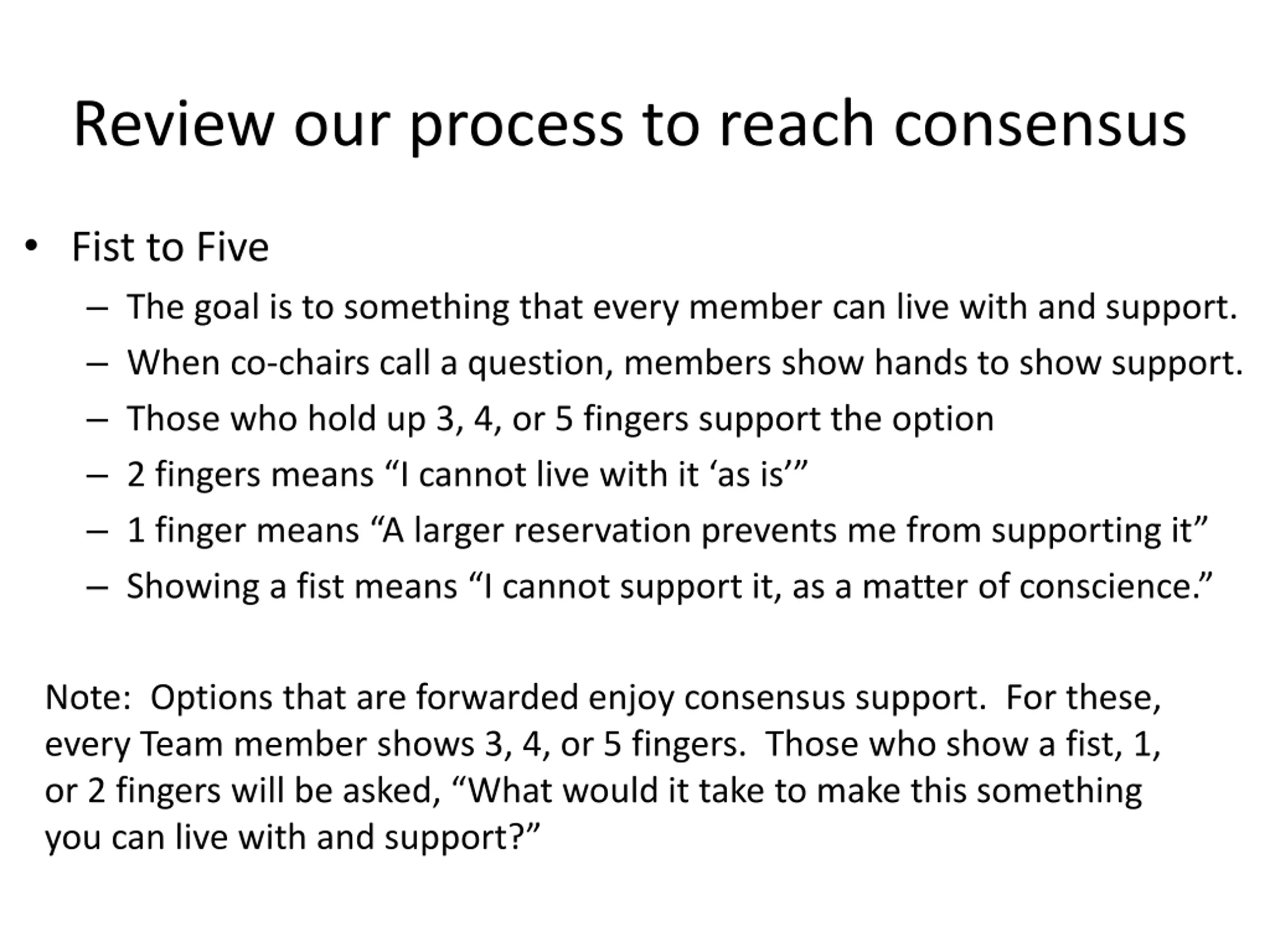 Review our process to reach consensus Fist to Five The goal is to something that every member can live with and support. When co-chairs call a question, members show hands to show support. Those who hold up 3, 4, or 5 fingers support the option 2 fingers means I cannot live with it as is 1 finger means A larger reservation prevents me from supporting it Showing a fist means I cannot support it, as a matter of conscience. Note: Options that are forwarded enjoy consensus support. For these, every Team member shows 3, 4, or 5 fingers. Those who show a fist, 1, or 2 fingers will be asked, What would it take to make this something you can live with and support?
