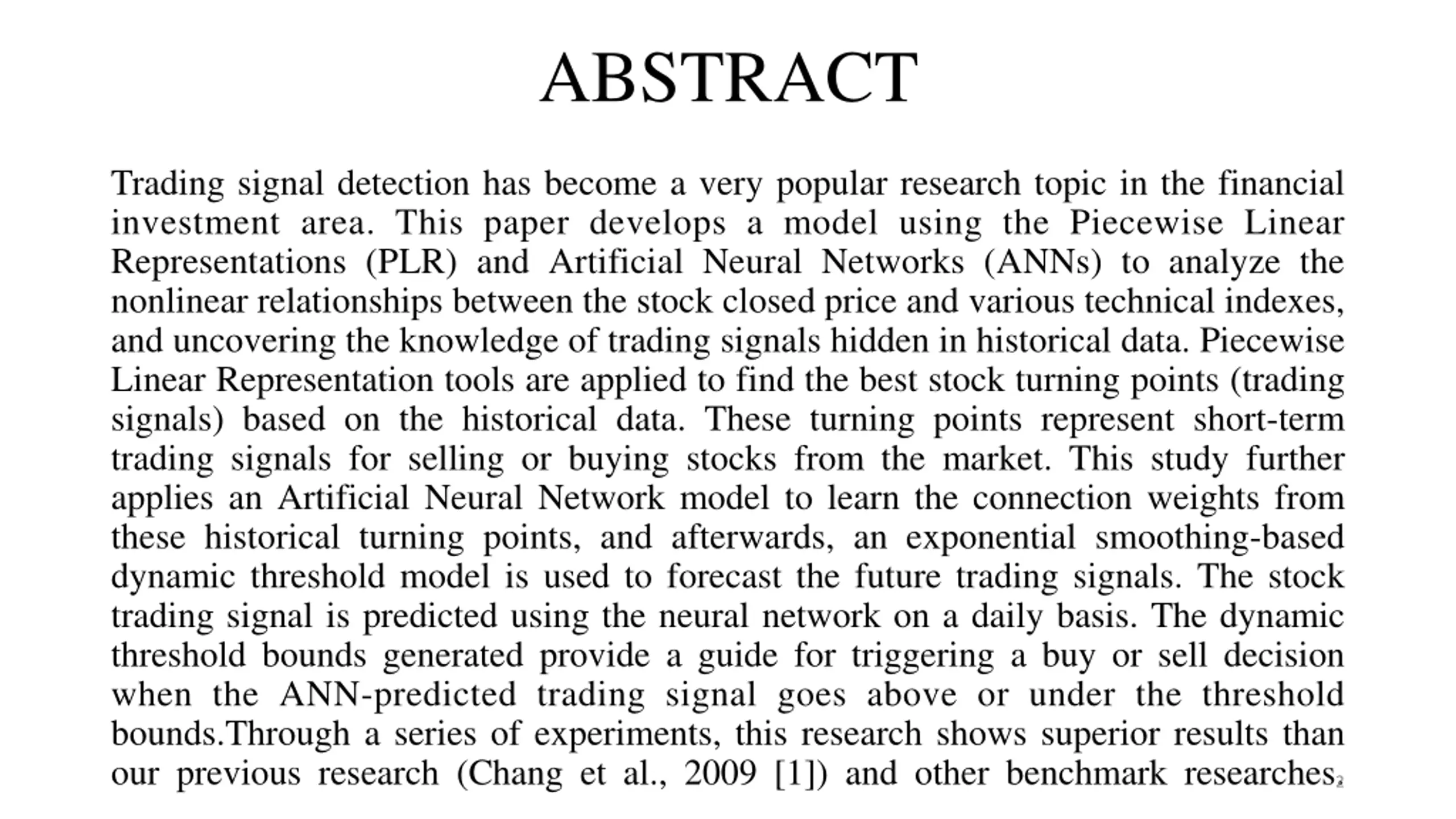 ABSTRACT Trading signal detection has become a very popular research topic in the financial investment area. This paper develops a model using the Piecewise Linear Representations (PLR) and Artificial Neural Networks (ANNs) to analyze the nonlinear relationships between the stock closed price and various technical indexes, and uncovering the knowledge of trading signals hidden in historical data. Piecewise Linear Representation tools are applied to find the best stock turning points (trading signals) based on the historical data. These turning points represent short-term trading signals for selling or buying stocks from the market. This study further applies an Artificial Neural Network model to learn the connection weights from these historical turning points, and afterwards, an exponential smoothing-based dynamic threshold model is used to forecast the future trading signals. The stock trading signal is predicted using the neural network on a daily basis. The dynamic threshold bounds generated provide a guide for triggering a buy or sell decision when the ANN-predicted trading signal goes above or under the threshold bounds.Through a series of experiments, this research shows superior results than our previous research (Chang et al., 2009 [1]) and other benchmark researches. 2