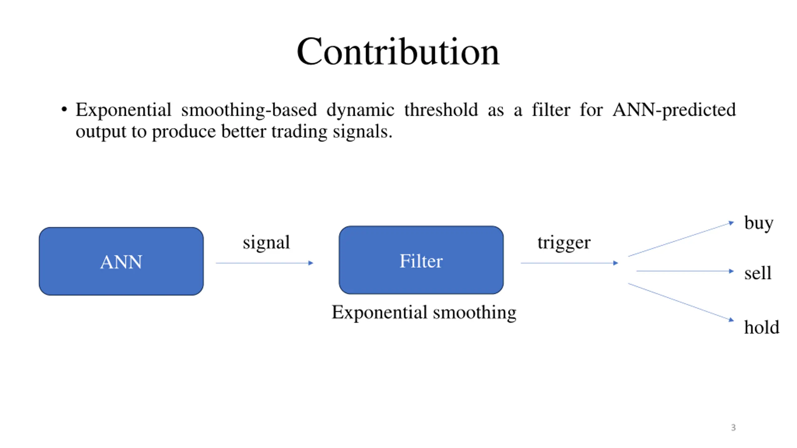 Contribution Exponential smoothing-based dynamic threshold as a filter for ANN-predicted output to produce better trading signals. buy signal trigger Filter ANN sell Exponential smoothing hold 3
