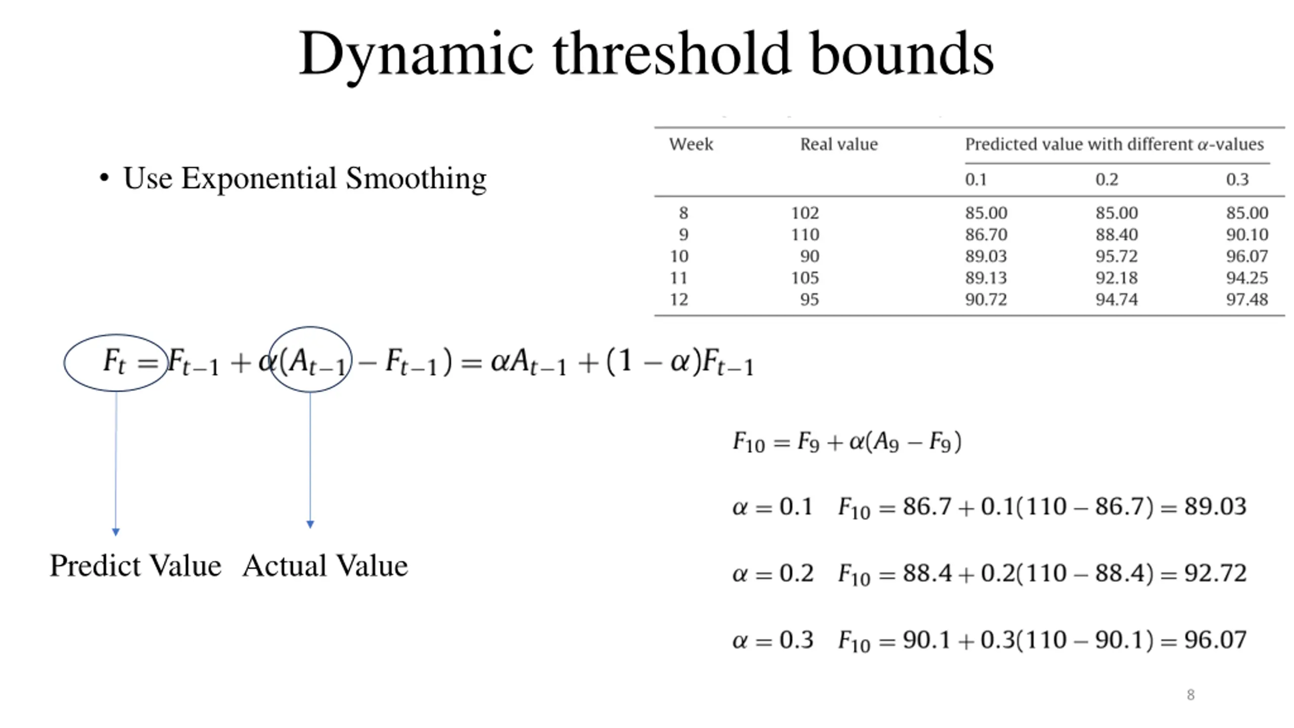 Dynamic threshold bounds Use Exponential Smoothing Predict Value Actual Value 8