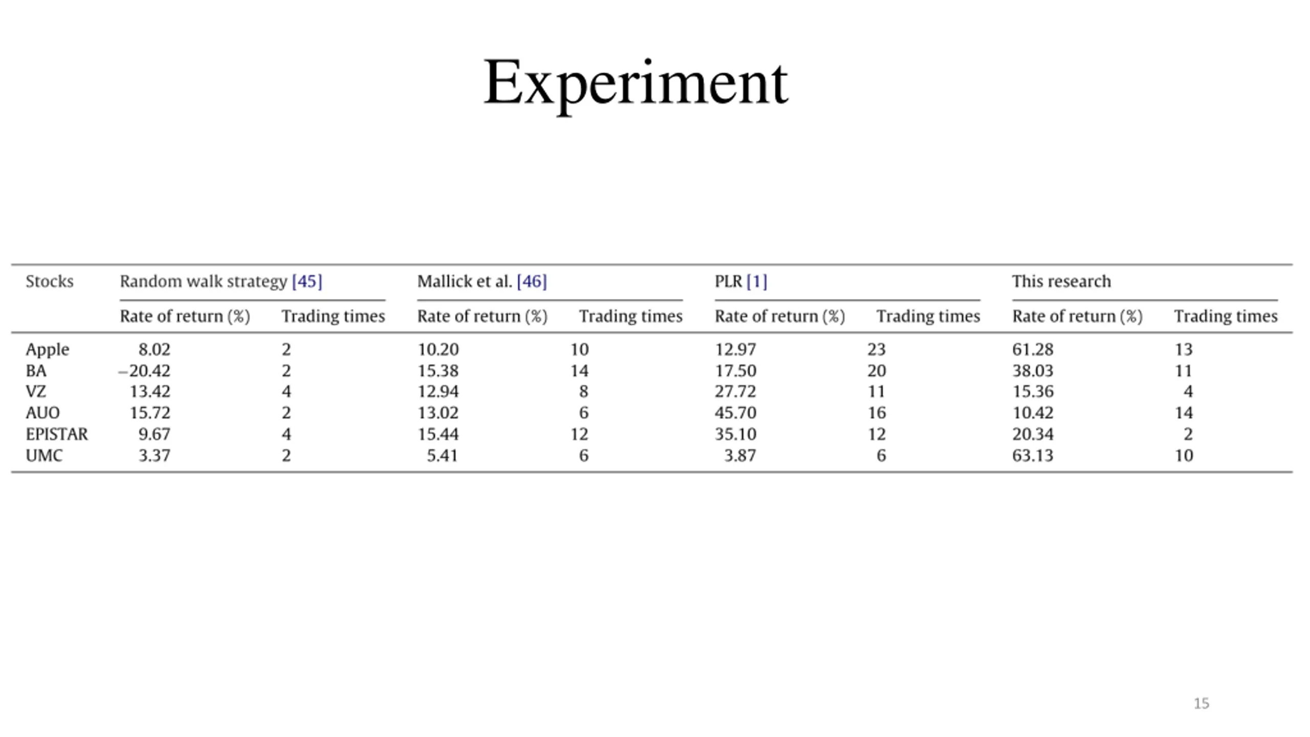 Experiment Training Period Testing Period Apple 2008/01/02 to 2008/12/30 2009/1/2to2009/6/30 Boeing Aerospace 2008/01/02 to 2008/12/30 2009/1/2 to 2009/6/30 Verizon Communications 2008/01/02 to 2008/12/30 2009/1/2 to 2009/6/30 Training Period Testing Period AUO 2006/1/2 to 2008/10/14 2008/10/15 to 2009/4/9 EPISTAR 2006/1/2 to 2008/10/14 2008/10/15 to 2009/4/9 UMC 2006/1/2 to 2008/10/14 2008/10/15 to 2009/4/9 11