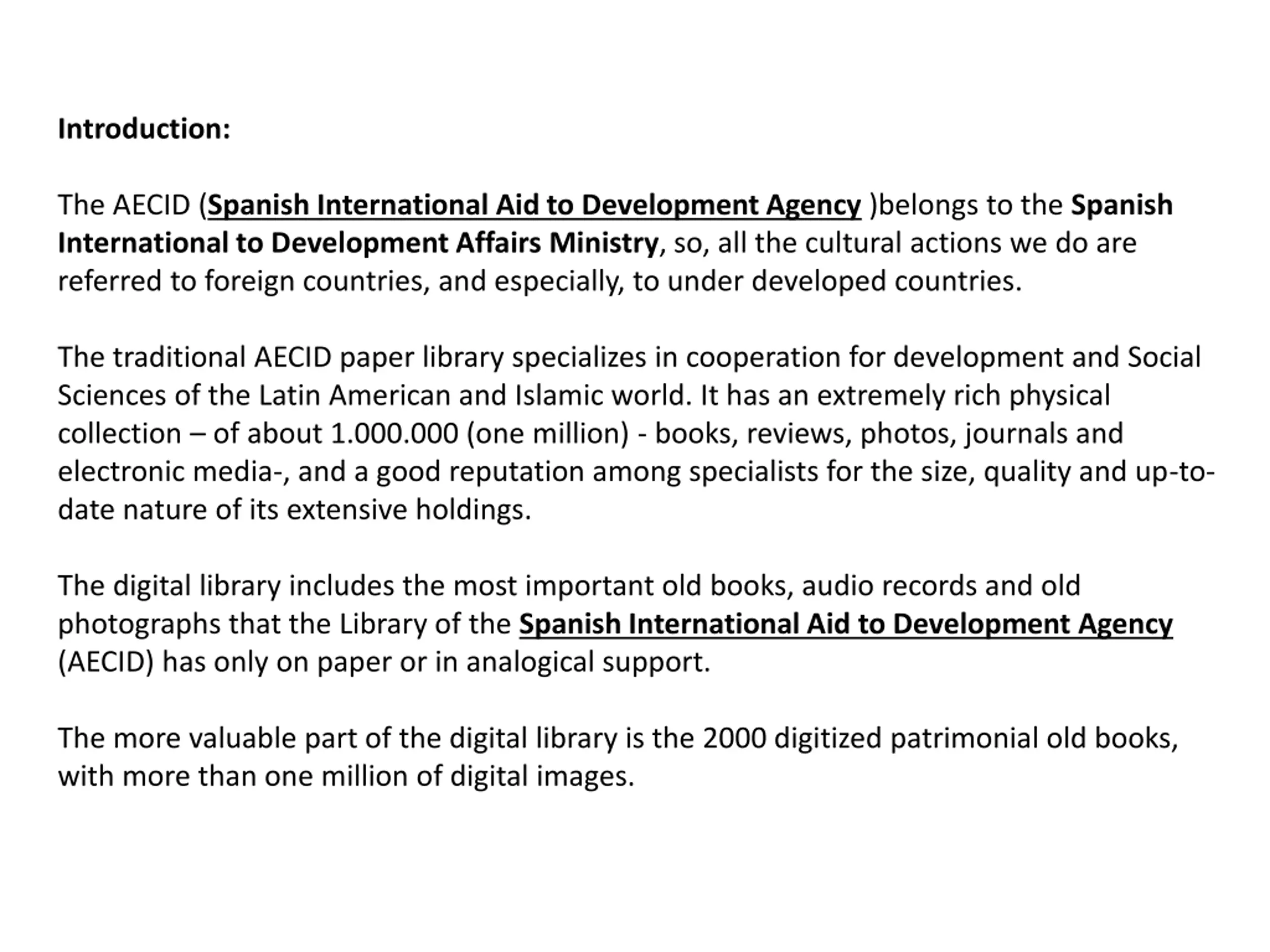 Introduction: The AECID (Spanish International Aid to Development Agency )belongs to the Spanish International to Development Affairs Ministry, so, all the cultural actions we do are referred to foreign countries, and especially, to under developed countries. The traditional AECID paper library specializes in cooperation for development and Social Sciences of the Latin American and Islamic world. It has an extremely rich physical collection of about 1.000.000 (one million) - books, reviews, photos, journals and electronic media-, and a good reputation among specialists for the size, quality and up-to- date nature of its extensive holdings. The digital library includes the most important old books, audio records and old photographs that the Library of the Spanish International Aid to Development Agency (AECID) has only on paper or in analogical support. The more valuable part of the digital library is the 2000 digitized patrimonial old books, with more than one million of digital images.