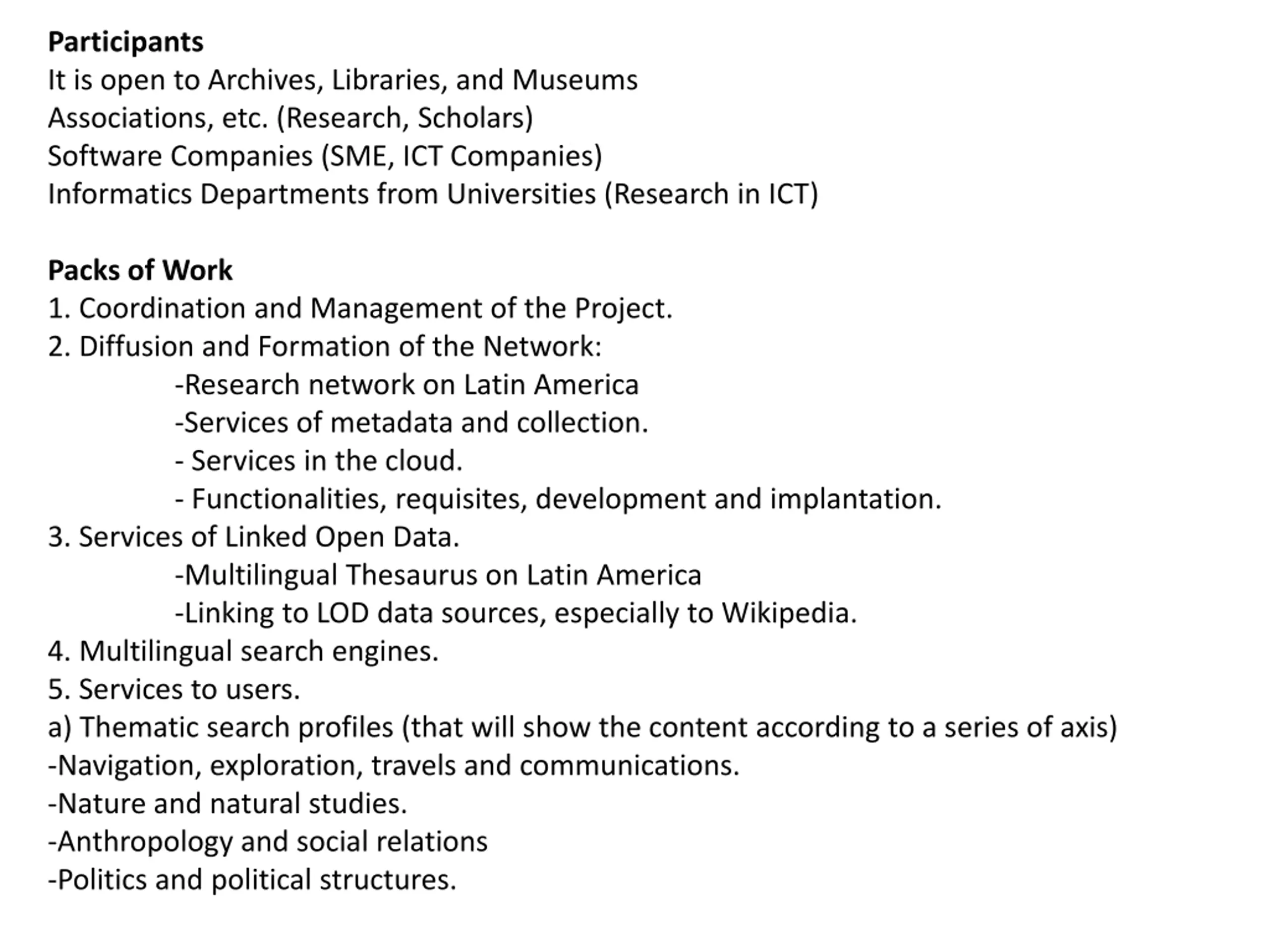 Participants It is open to Archives, Libraries, and Museums Associations, etc. (Research, Scholars) Software Companies (SME, ICT Companies) Informatics Departments from Universities (Research in ICT) Packs of Work 1. Coordination and Management of the Project. 2. Diffusion and Formation of the Network: -Research network on Latin America -Services of metadata and collection. - Services in the cloud. - Functionalities, requisites, development and implantation. 3. Services of Linked Open Data. -Multilingual Thesaurus on Latin America -Linking to LOD data sources, especially to Wikipedia. 4. Multilingual search engines. 5. Services to users. a) Thematic search profiles (that will show the content according to a series of axis) -Navigation, exploration, travels and communications. -Nature and natural studies. -Anthropology and social relations -Politics and political structures.