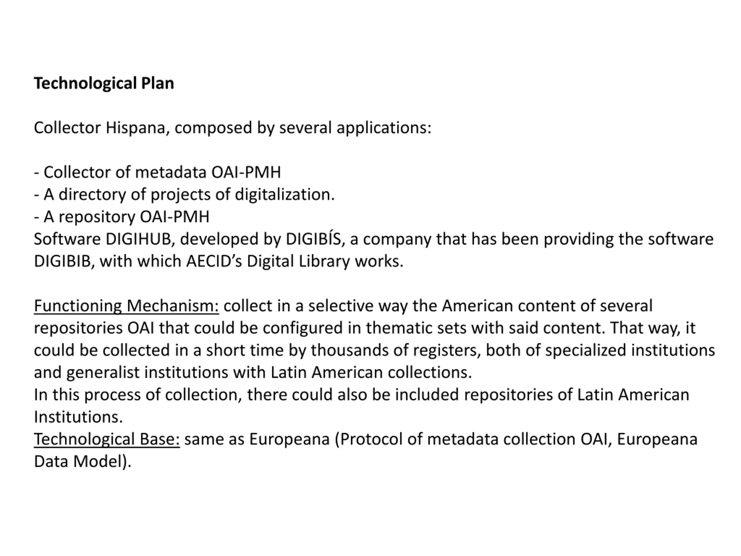 Technological Plan Collector Hispana, composed by several applications: - Collector of metadata OAI-PMH - A directory of projects of digitalization. - A repository OAI-PMH Software DIGIHUB, developed by DIGIB S, a company that has been providing the software DIGIBIB, with which AECID s Digital Library works. Functioning Mechanism: collect in a selective way the American content of several repositories OAI that could be configured in thematic sets with said content. That way, it could be collected in a short time by thousands of registers, both of specialized institutions and generalist institutions with Latin American collections. In this process of collection, there could also be included repositories of Latin American Institutions. Technological Base: same as Europeana (Protocol of metadata collection OAI, Europeana Data Model).