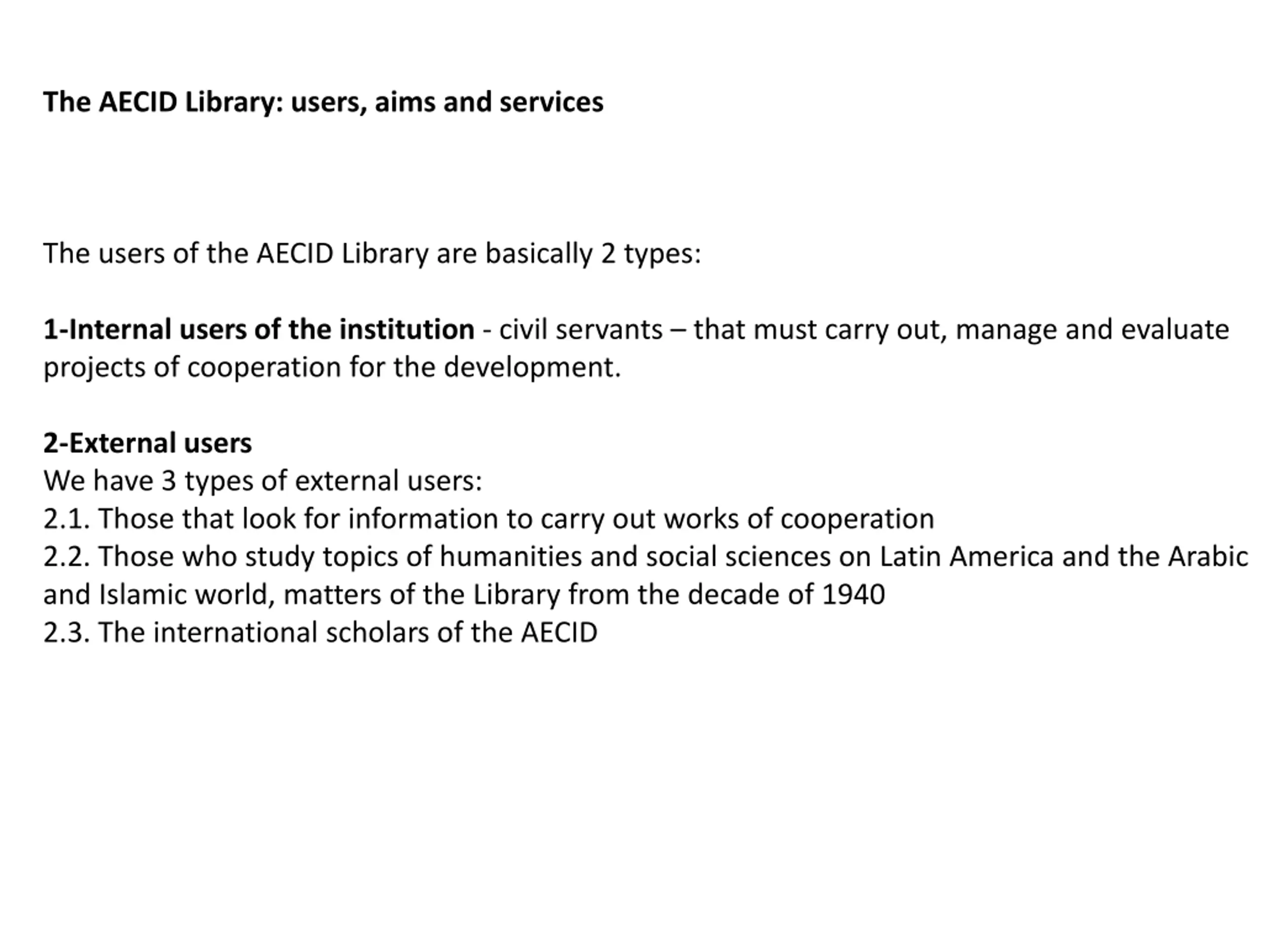 The AECID Library: users, aims and services The users of the AECID Library are basically 2 types: 1-Internal users of the institution - civil servants that must carry out, manage and evaluate projects of cooperation for the development. 2-External users We have 3 types of external users: 2.1. Those that look for information to carry out works of cooperation 2.2. Those who study topics of humanities and social sciences on Latin America and the Arabic and Islamic world, matters of the Library from the decade of 1940 2.3. The international scholars of the AECID