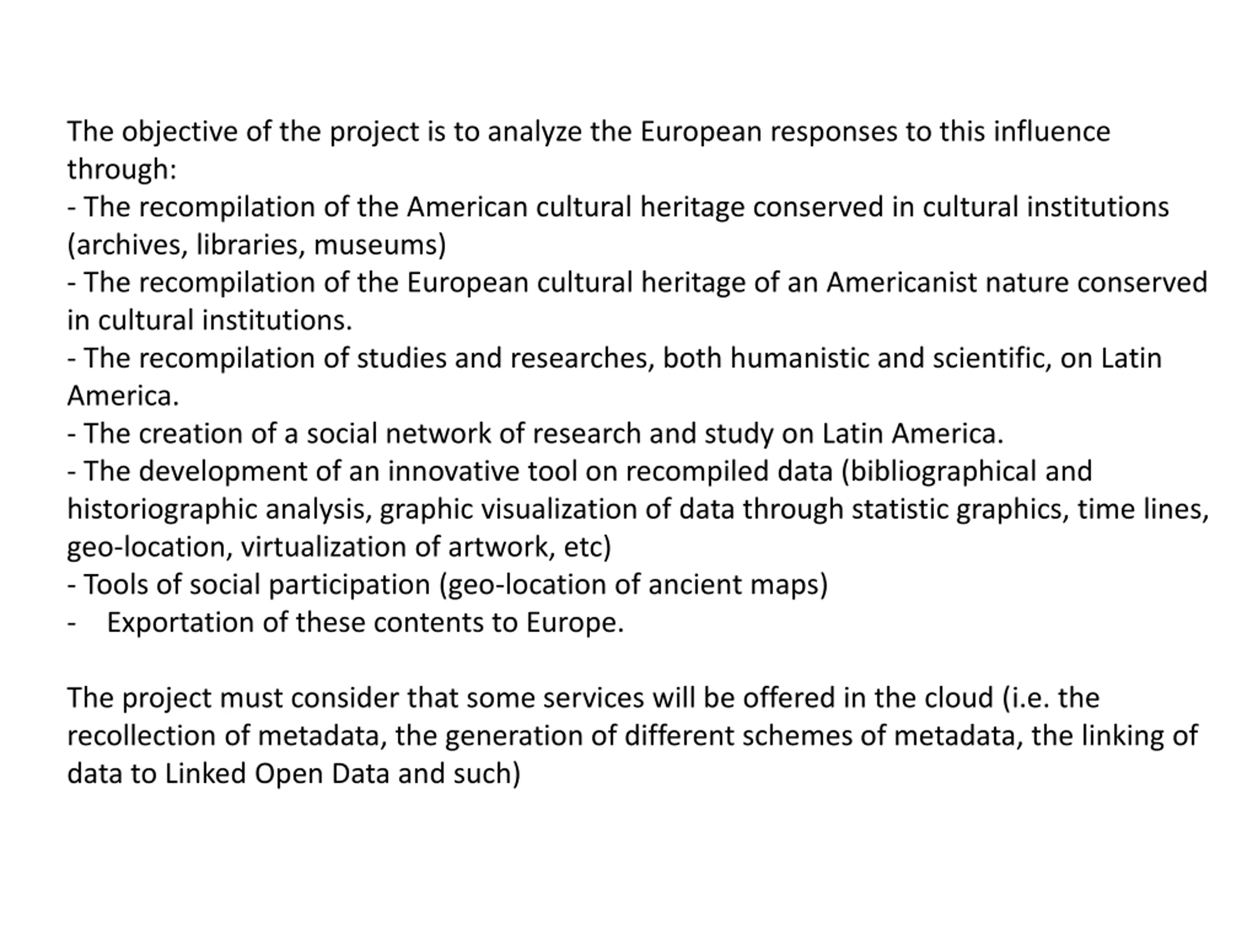 The objective of the project is to analyze the European responses to this influence through: - The recompilation of the American cultural heritage conserved in cultural institutions (archives, libraries, museums) - The recompilation of the European cultural heritage of an Americanist nature conserved in cultural institutions. - The recompilation of studies and researches, both humanistic and scientific, on Latin America. - The creation of a social network of research and study on Latin America. - The development of an innovative tool on recompiled data (bibliographical and historiographic analysis, graphic visualization of data through statistic graphics, time lines, geo-location, virtualization of artwork, etc) - Tools of social participation (geo-location of ancient maps) - Exportation of these contents to Europe. The project must consider that some services will be offered in the cloud (i.e. the recollection of metadata, the generation of different schemes of metadata, the linking of data to Linked Open Data and such)