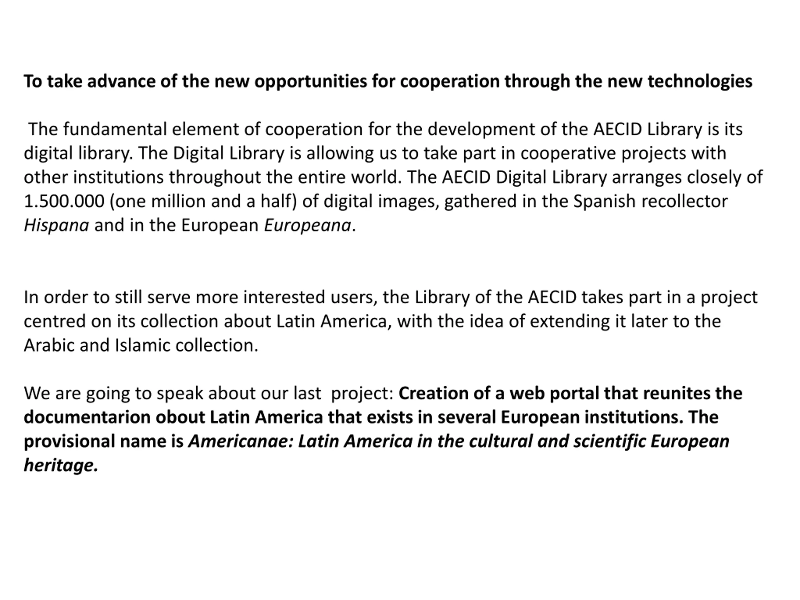 To take advance of the new opportunities for cooperation through the new technologies The fundamental element of cooperation for the development of the AECID Library is its digital library. The Digital Library is allowing us to take part in cooperative projects with other institutions throughout the entire world. The AECID Digital Library arranges closely of 1.500.000 (one million and a half) of digital images, gathered in the Spanish recollector Hispana and in the European Europeana. In order to still serve more interested users, the Library of the AECID takes part in a project centred on its collection about Latin America, with the idea of extending it later to the Arabic and Islamic collection. We are going to speak about our last project: Creation of a web portal that reunites the documentarion obout Latin America that exists in several European institutions. The provisional name is Americanae: Latin America in the cultural and scientific European heritage.