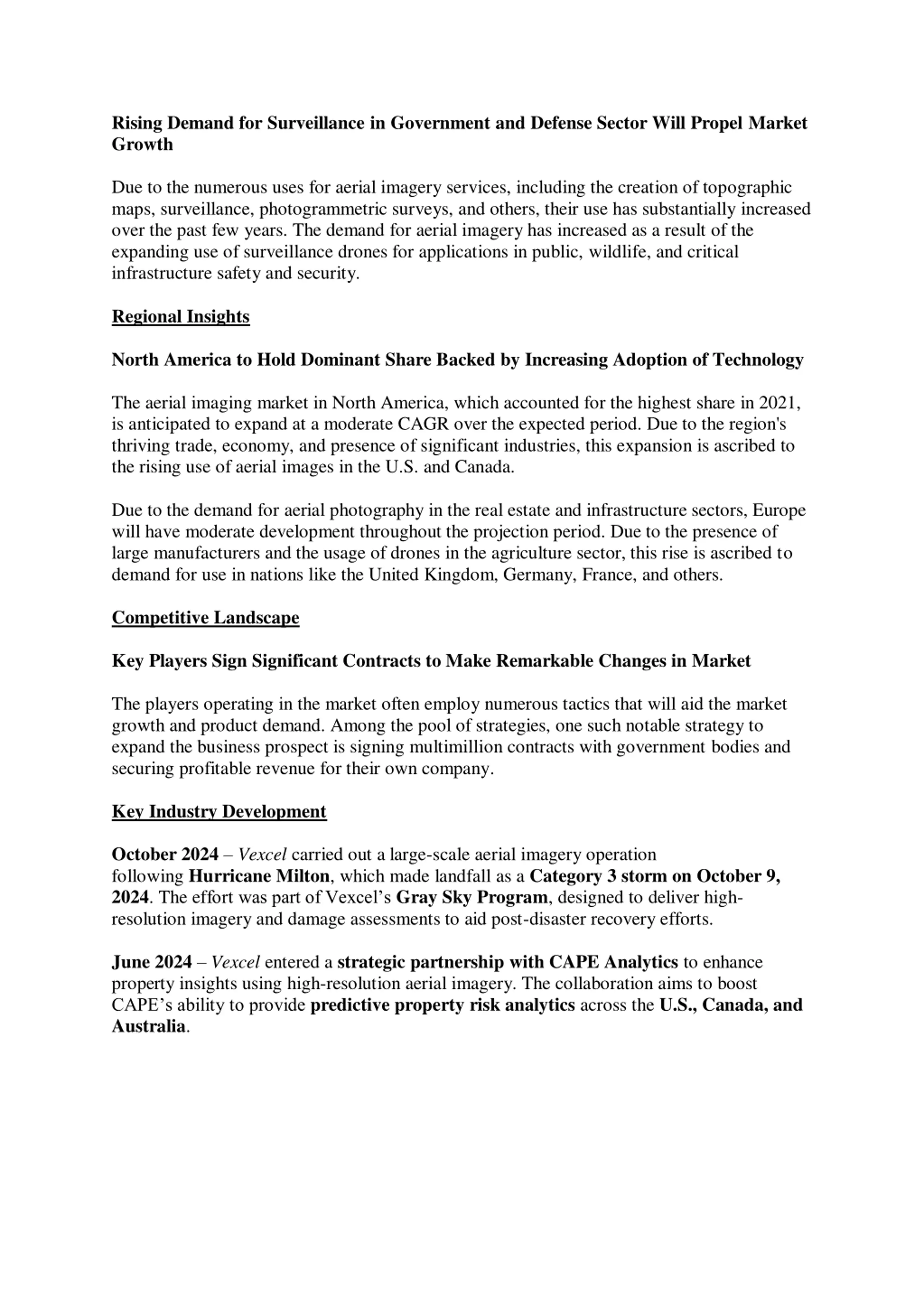 Rising Demand for Surveillance in Government and Defense Sector Will Propel Market Growth Due to the numerous uses for aerial imagery services, including the creation of topographic maps, surveillance, photogrammetric surveys, and others, their use has substantially increased over the past few years. The demand for aerial imagery has increased as a result of the expanding use of surveillance drones for applications in public, wildlife, and critical infrastructure safety and security. Regional Insights North America to Hold Dominant Share Backed by Increasing Adoption of Technology The aerial imaging market in North America, which accounted for the highest share in 2021, is anticipated to expand at a moderate CAGR over the expected period. Due to the region's thriving trade, economy, and presence of significant industries, this expansion is ascribed to the rising use of aerial images in the U.S. and Canada. Due to the demand for aerial photography in the real estate and infrastructure sectors, Europe will have moderate development throughout the projection period. Due to the presence of large manufacturers and the usage of drones in the agriculture sector, this rise is ascribed to demand for use in nations like the United Kingdom, Germany, France, and others. Competitive Landscape Key Players Sign Significant Contracts to Make Remarkable Changes in Market The players operating in the market often employ numerous tactics that will aid the market growth and product demand. Among the pool of strategies, one such notable strategy to expand the business prospect is signing multimillion contracts with government bodies and securing profitable revenue for their own company. Key Industry Development October 2024 Vexcel carried out a large-scale aerial imagery operation following Hurricane Milton, which made landfall as a Category 3 storm on October 9, 2024. The effort was part of Vexcel sGray Sky Program, designed to deliver high- resolution imagery and damage assessments to aid post-disaster recovery efforts. June 2024 Vexcel entered a strategic partnership with CAPE Analytics to enhance property insights using high-resolution aerial imagery. The collaboration aims to boost CAPE s ability to providepredictive property risk analytics across the U.S., Canada, and Australia.