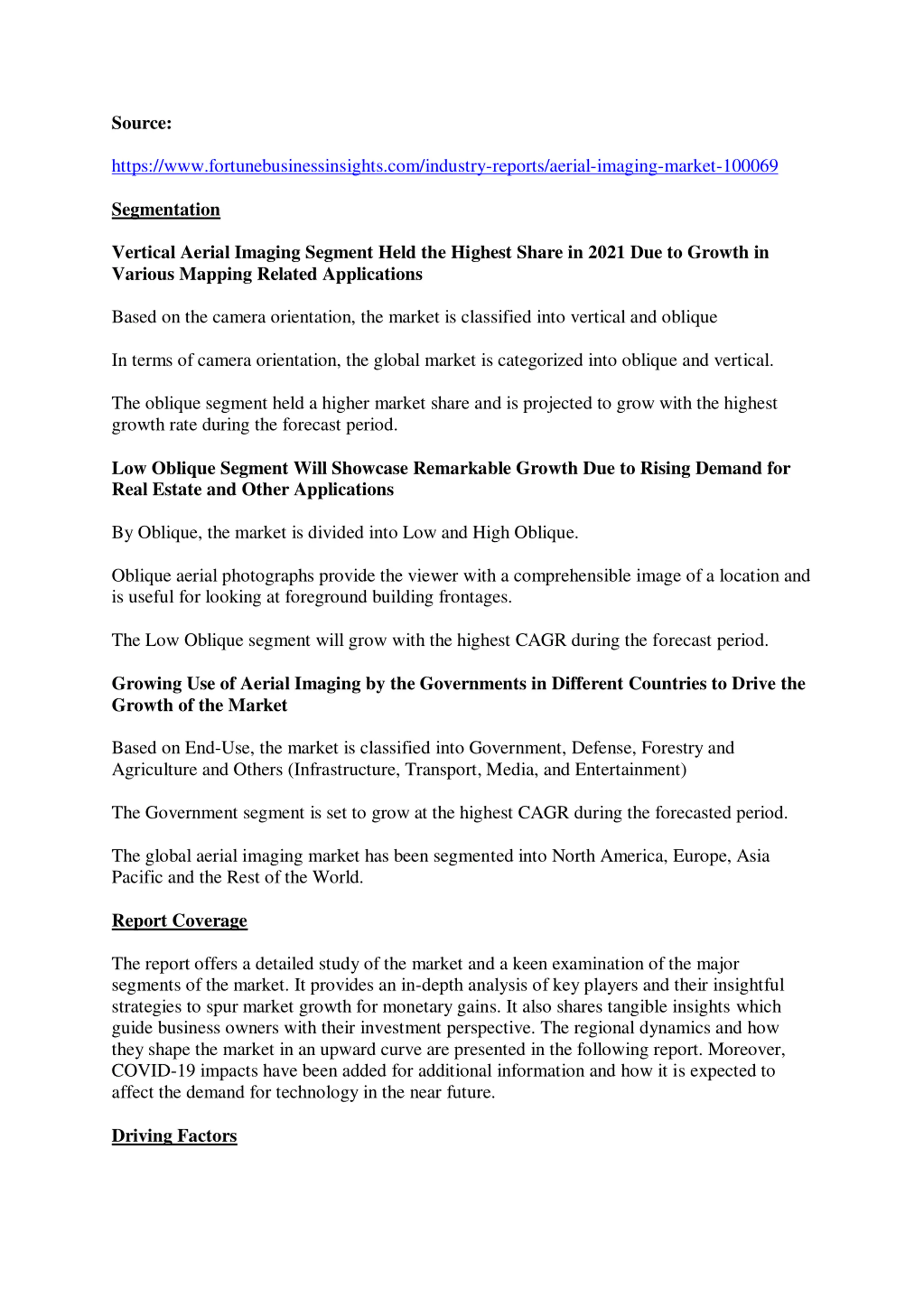 Source: https://www.fortunebusinessinsights.com/industry-reports/aerial-imaging-market-100069 Segmentation Vertical Aerial Imaging Segment Held the Highest Share in 2021 Due to Growth in Various Mapping Related Applications Based on the camera orientation, the market is classified into vertical and oblique In terms of camera orientation, the global market is categorized into oblique and vertical. The oblique segment held a higher market share and is projected to grow with the highest growth rate during the forecast period. Low Oblique Segment Will Showcase Remarkable Growth Due to Rising Demand for Real Estate and Other Applications By Oblique, the market is divided into Low and High Oblique. Oblique aerial photographs provide the viewer with a comprehensible image of a location and is useful for looking at foreground building frontages. The Low Oblique segment will grow with the highest CAGR during the forecast period. Growing Use of Aerial Imaging by the Governments in Different Countries to Drive the Growth of the Market Based on End-Use, the market is classified into Government, Defense, Forestry and Agriculture and Others (Infrastructure, Transport, Media, and Entertainment) The Government segment is set to grow at the highest CAGR during the forecasted period. The global aerial imaging market has been segmented into North America, Europe, Asia Pacific and the Rest of the World. Report Coverage The report offers a detailed study of the market and a keen examination of the major segments of the market. It provides an in-depth analysis of key players and their insightful strategies to spur market growth for monetary gains. It also shares tangible insights which guide business owners with their investment perspective. The regional dynamics and how they shape the market in an upward curve are presented in the following report. Moreover, COVID-19 impacts have been added for additional information and how it is expected to affect the demand for technology in the near future. Driving Factors