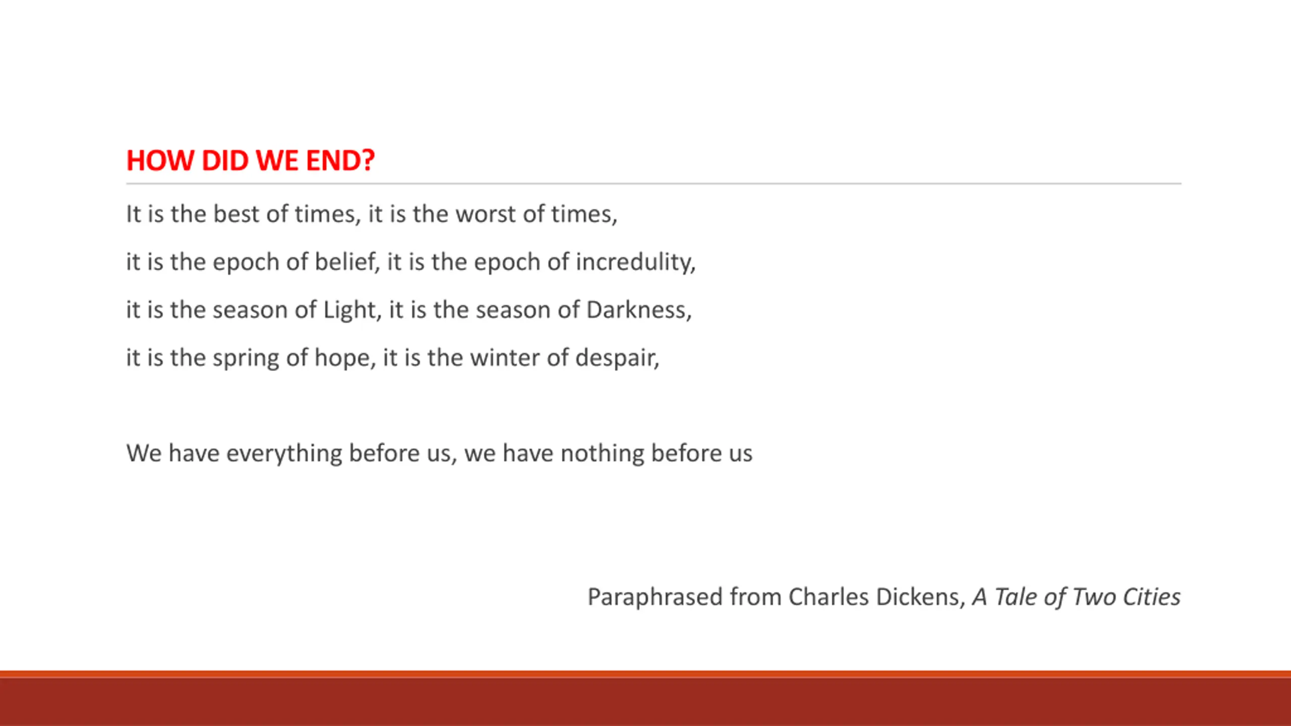 HOW DID WE END? It is the best of times, it is the worst of times, it is the epoch of belief, it is the epoch of incredulity, it is the season of Light, it is the season of Darkness, it is the spring of hope, it is the winter of despair, We have everything before us, we have nothing before us Paraphrased from Charles Dickens, A Tale of Two Cities