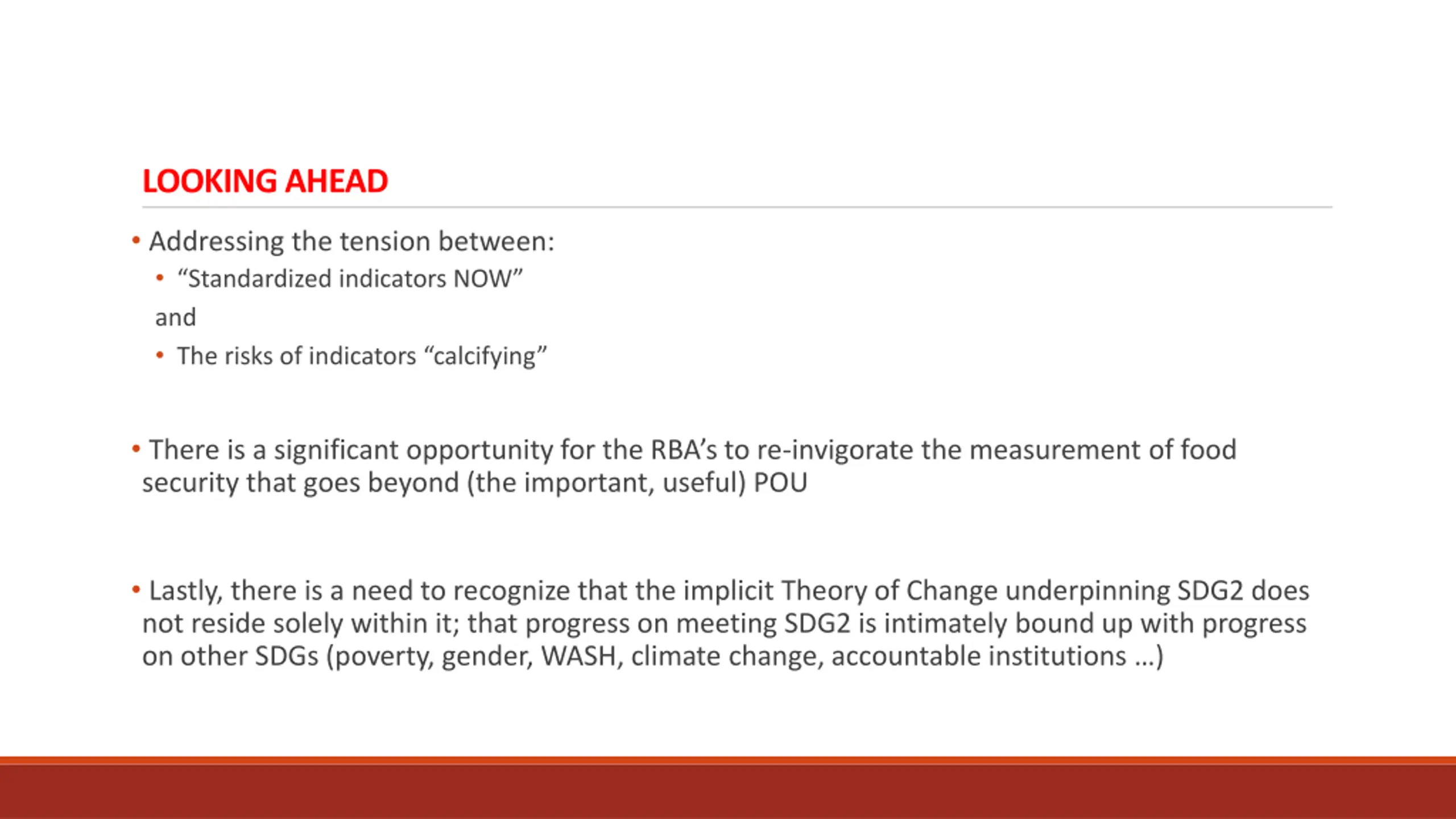 LOOKING AHEAD Addressing the tension between: Standardized indicators NOW and The risks of indicators calcifying There is a significant opportunity for the RBA s to re-invigorate the measurement of food security that goes beyond (the important, useful) POU Lastly, there is a need to recognize that the implicit Theory of Change underpinning SDG2 does not reside solely within it; that progress on meeting SDG2 is intimately bound up with progress on other SDGs (poverty, gender, WASH, climate change, accountable institutions )