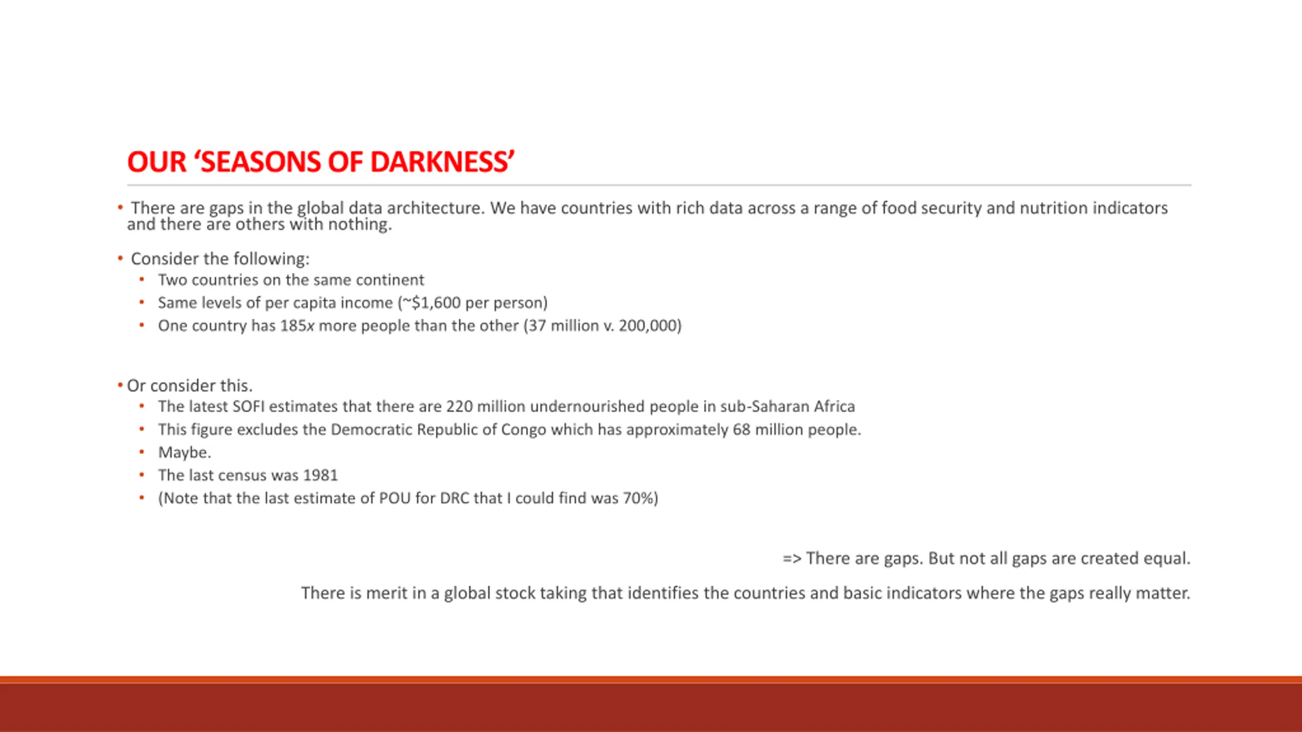 OUR SEASONS OF DARKNESS There are gaps in the global data architecture. We have countries with rich data across a range of food security and nutrition indicators and there are others with nothing. Consider the following: Two countries on the same continent Same levels of per capita income (~$1,600 per person) One country has 185x more people than the other (37 million v. 200,000) Or consider this. The latest SOFI estimates that there are 220 million undernourished people in sub-Saharan Africa This figure excludes the Democratic Republic of Congo which has approximately 68 million people. Maybe. The last census was 1981 (Note that the last estimate of POU for DRC that I could find was 70%) => There are gaps. But not all gaps are created equal. There is merit in a global stock taking that identifies the countries and basic indicators where the gaps really matter.