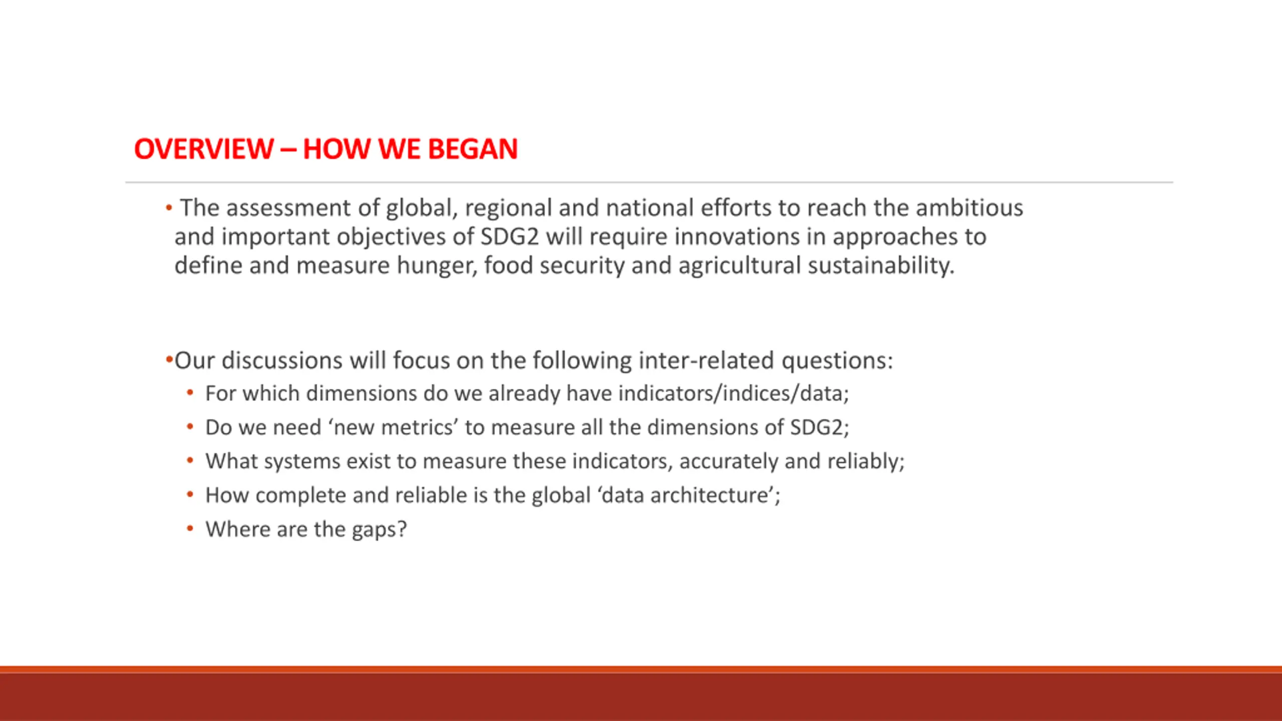 OVERVIEW HOW WE BEGAN The assessment of global, regional and national efforts to reach the ambitious and important objectives of SDG2 will require innovations in approaches to define and measure hunger, food security and agricultural sustainability. Our discussions will focus on the following inter-related questions: For which dimensions do we already have indicators/indices/data; Do we need new metrics to measure all the dimensions of SDG2; What systems exist to measure these indicators, accurately and reliably; How complete and reliable is the global data architecture ; Where are the gaps?