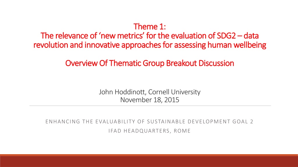 Theme 1: Theme 1: The relevance of new metrics for the evaluation of SDG2 The relevance of new metrics for the evaluation of SDG2 data revolution and innovative approaches for assessing human revolution and innovative approaches for assessing human wellbeing data wellbeing Overview Of Thematic Group Breakout Discussion Overview Of Thematic Group Breakout Discussion John Hoddinott, Cornell University November 18, 2015 ENHANCING THE EVALUABILITY OF SUSTAINABLE DEVELOPMENT GOAL 2 IFAD HEADQUARTERS, ROME
