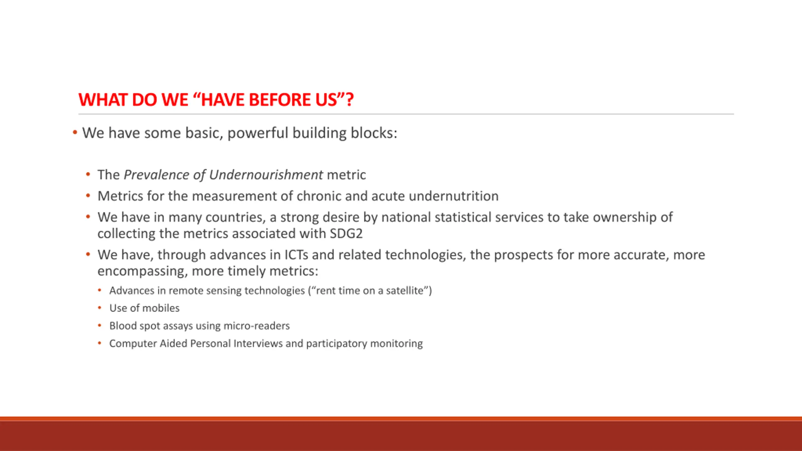 WHAT DO WE HAVE BEFORE US? We have some basic, powerful building blocks: The Prevalence of Undernourishment metric Metrics for the measurement of chronic and acute undernutrition We have in many countries, a strong desire by national statistical services to take ownership of collecting the metrics associated with SDG2 We have, through advances in ICTs and related technologies, the prospects for more accurate, more encompassing, more timely metrics: Advances in remote sensing technologies ( rent time on a satellite ) Use of mobiles Blood spot assays using micro-readers Computer Aided Personal Interviews and participatory monitoring