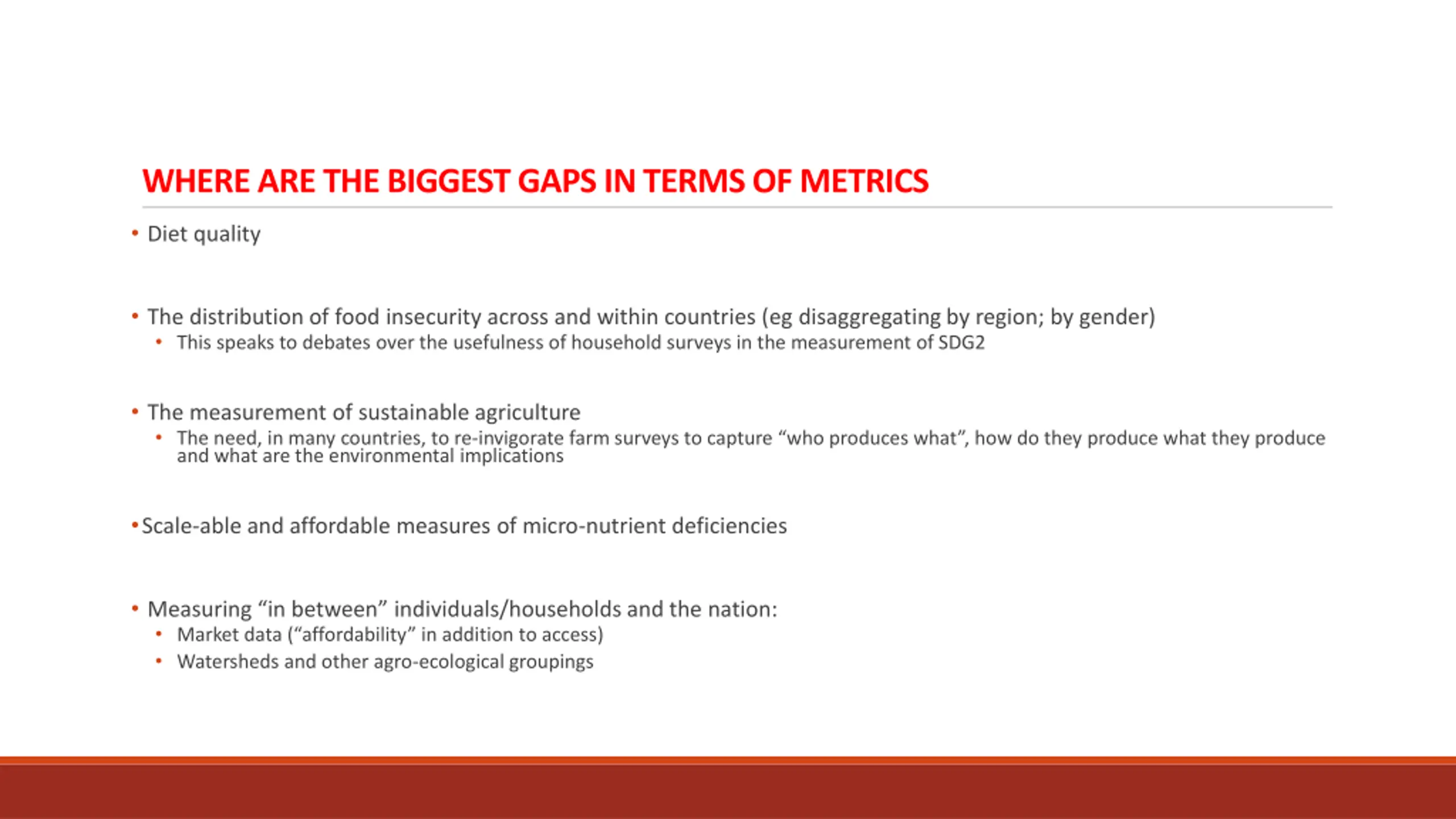 WHERE ARE THE BIGGEST GAPS IN TERMS OF METRICS Diet quality The distribution of food insecurity across and within countries (eg disaggregating by region; by gender) This speaks to debates over the usefulness of household surveys in the measurement of SDG2 The measurement of sustainable agriculture The need, in many countries, to re-invigorate farm surveys to capture who produces what , how do they produce what they produce and what are the environmental implications Scale-able and affordable measures of micro-nutrient deficiencies Measuring in between individuals/households and the nation: Market data ( affordability in addition to access) Watersheds and other agro-ecological groupings