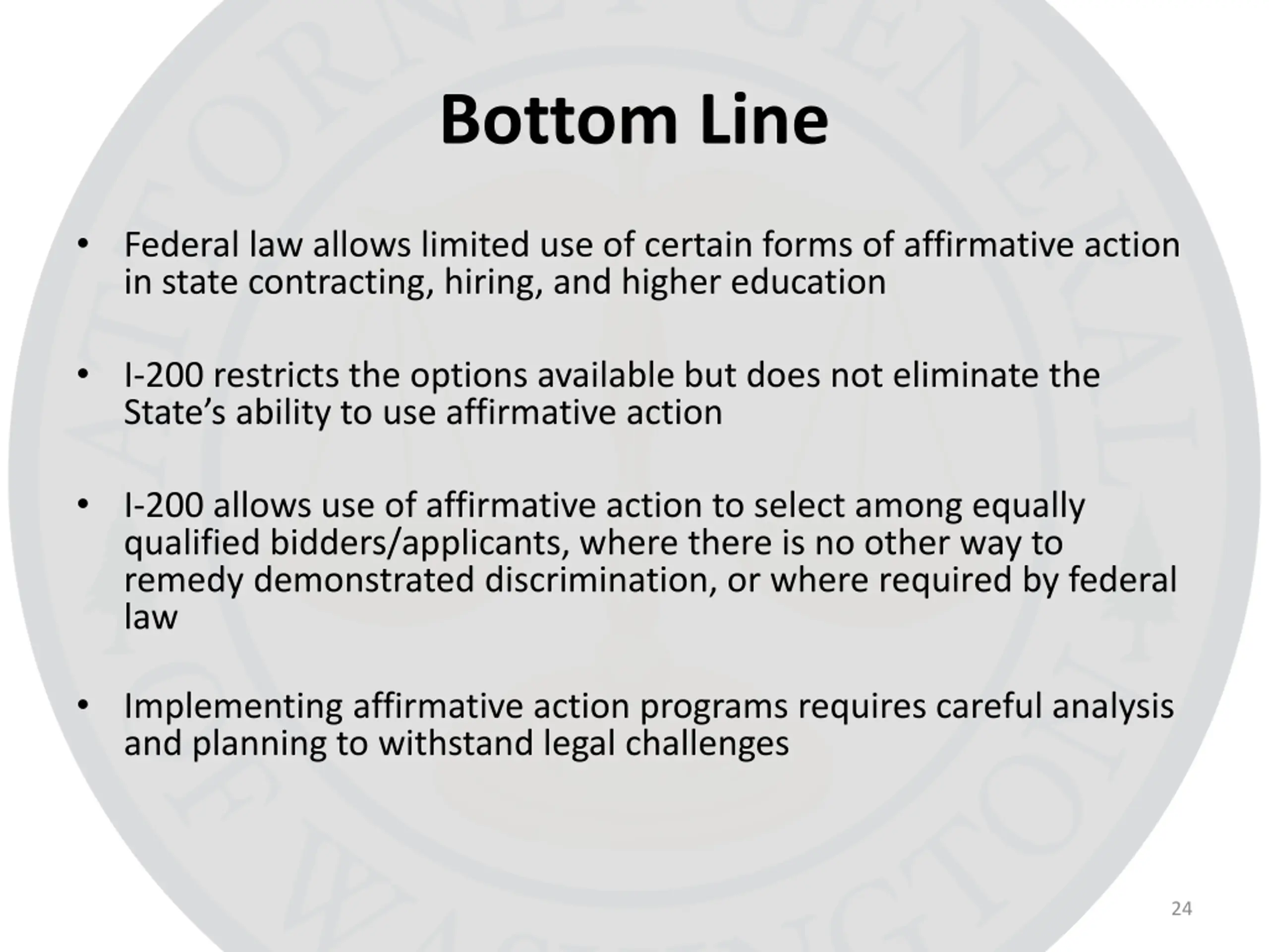 Bottom Line Federal law allows limited use of certain forms of affirmative action in state contracting, hiring, and higher education I-200 restricts the options available but does not eliminate the State s ability to use affirmative action I-200 allows use of affirmative action to select among equally qualified bidders/applicants, where there is no other way to remedy demonstrated discrimination, or where required by federal law Implementing affirmative action programs requires careful analysis and planning to withstand legal challenges 24