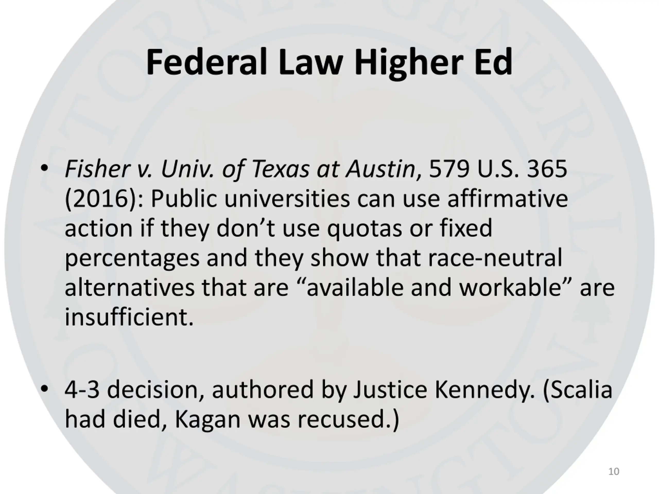 Federal Law Higher Ed Fisher v. Univ. of Texas at Austin, 579 U.S. 365 (2016): Public universities can use affirmative action if they don t use quotas or fixed percentages and they show that race-neutral alternatives that are available and workable are insufficient. 4-3 decision, authored by Justice Kennedy. (Scalia had died, Kagan was recused.) 10