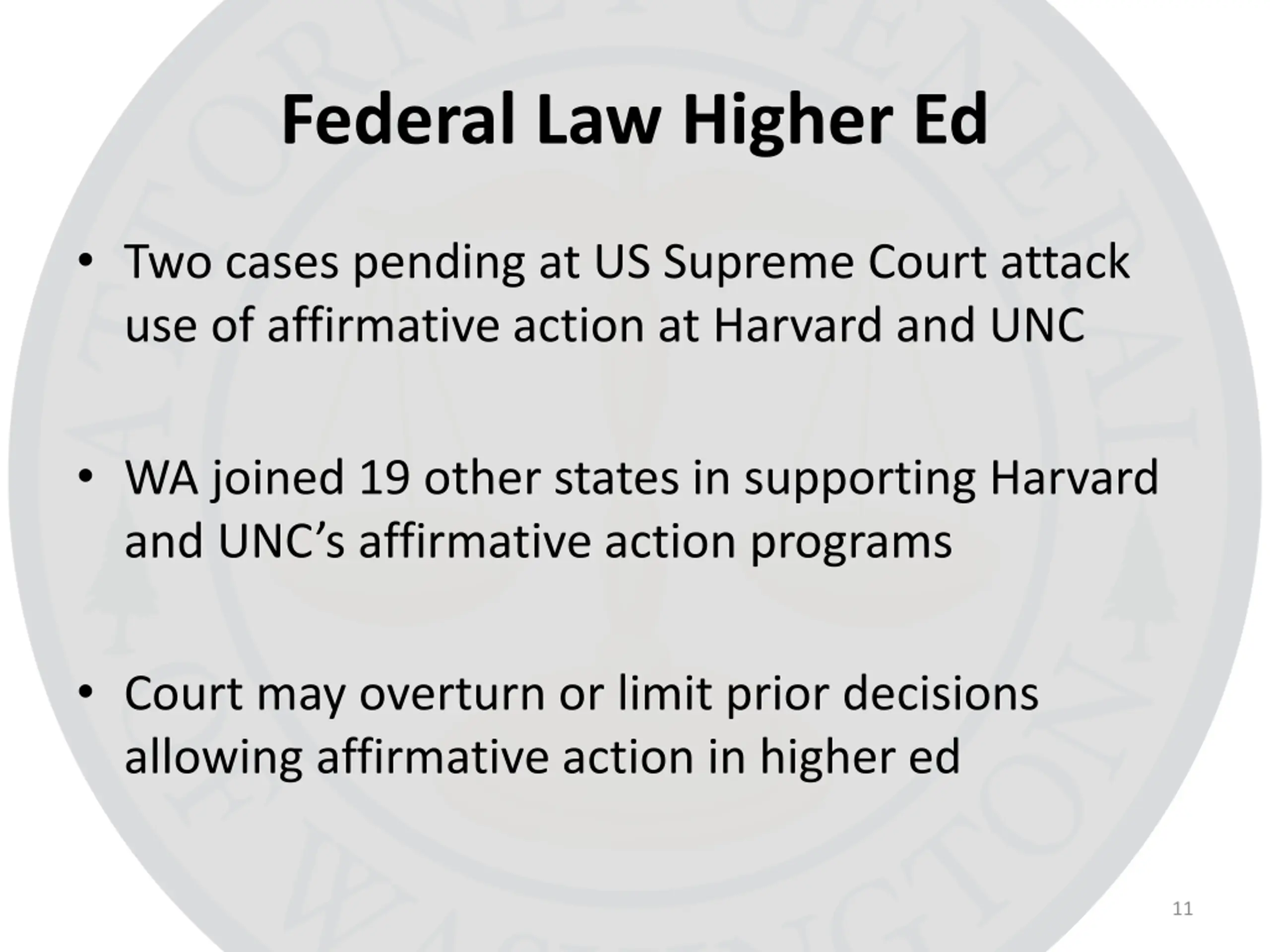 Federal Law Higher Ed Two cases pending at US Supreme Court attack use of affirmative action at Harvard and UNC WA joined 19 other states in supporting Harvard and UNC s affirmative action programs Court may overturn or limit prior decisions allowing affirmative action in higher ed 11