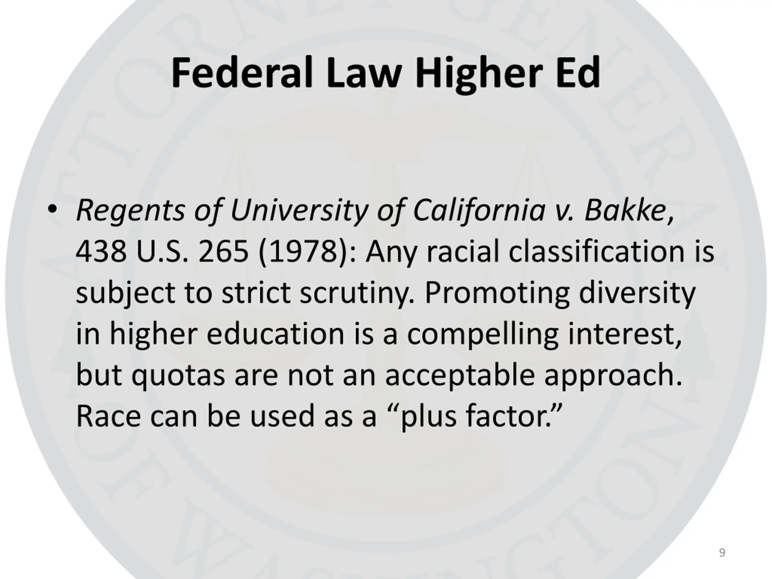 Federal Law Higher Ed Regents of University of California v. Bakke, 438 U.S. 265 (1978): Any racial classification is subject to strict scrutiny. Promoting diversity in higher education is a compelling interest, but quotas are not an acceptable approach. Race can be used as a plus factor. 9