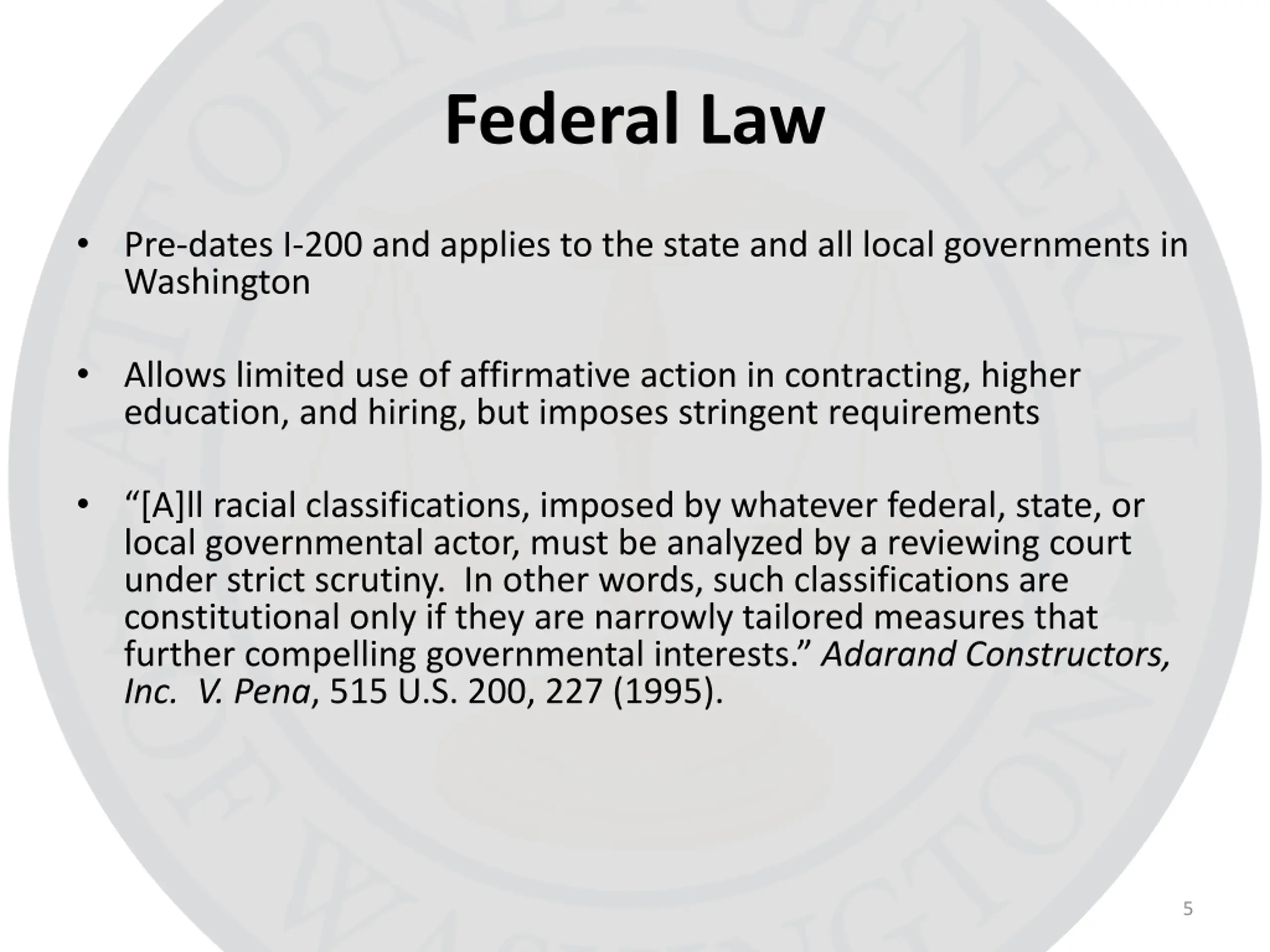 Federal Law Pre-dates I-200 and applies to the state and all local governments in Washington Allows limited use of affirmative action in contracting, higher education, and hiring, but imposes stringent requirements [A]ll racial classifications, imposed by whatever federal, state, or local governmental actor, must be analyzed by a reviewing court under strict scrutiny. In other words, such classifications are constitutional only if they are narrowly tailored measures that further compelling governmental interests. Adarand Constructors, Inc. V. Pena, 515 U.S. 200, 227 (1995). 5