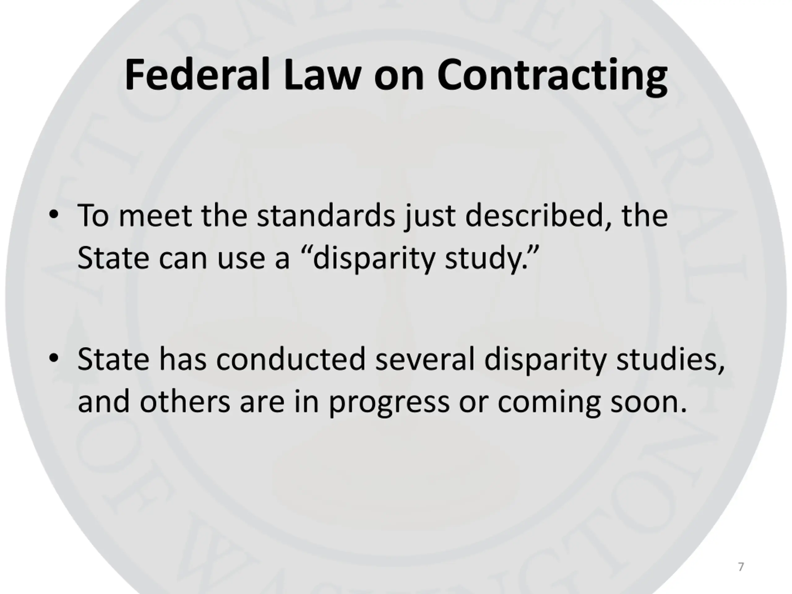 Federal Law on Contracting To meet the standards just described, the State can use a disparity study. State has conducted several disparity studies, and others are in progress or coming soon. 7