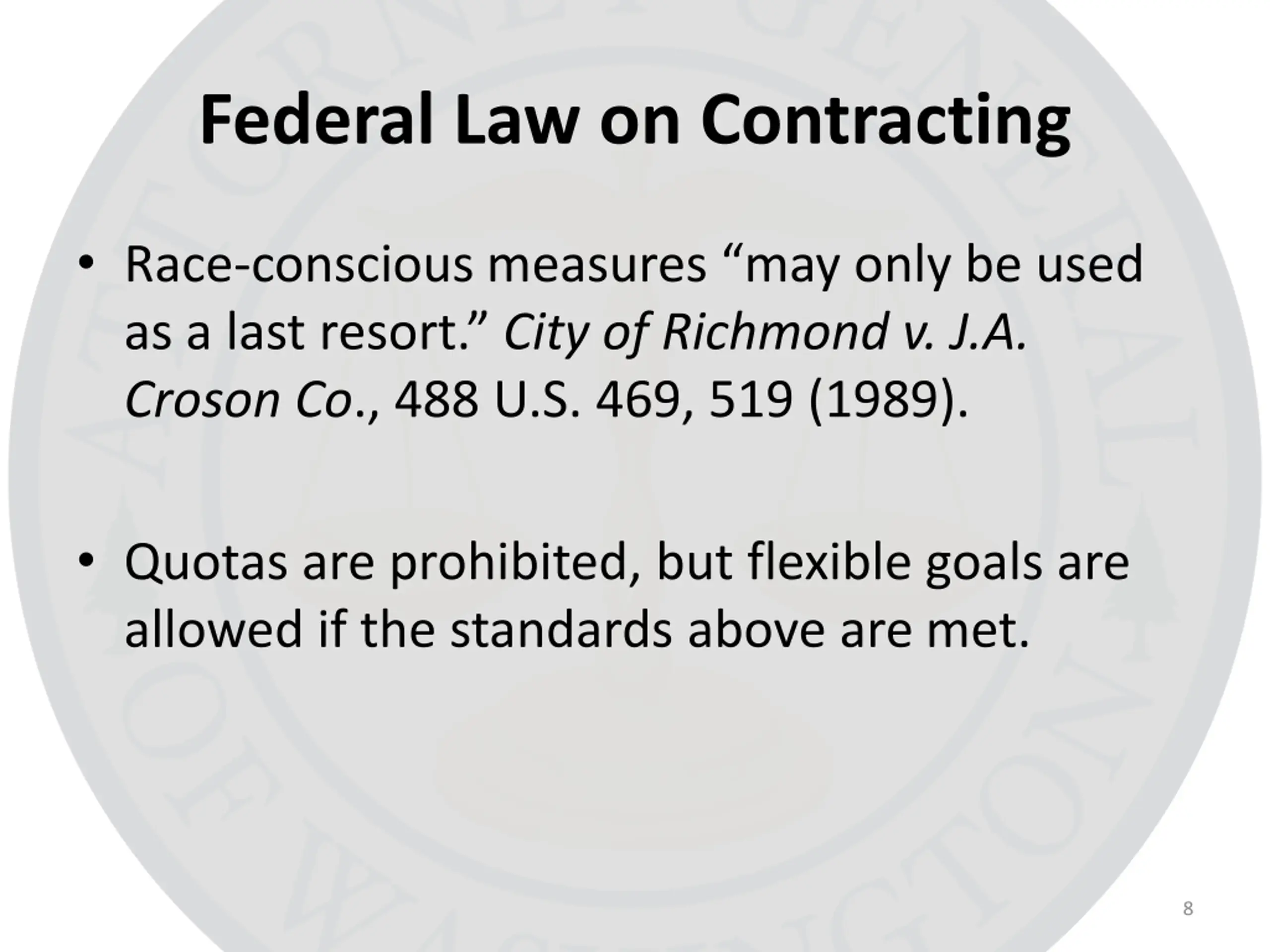 Federal Law on Contracting Race-conscious measures may only be used as a last resort. City of Richmond v. J.A. Croson Co., 488 U.S. 469, 519 (1989). Quotas are prohibited, but flexible goals are allowed if the standards above are met. 8