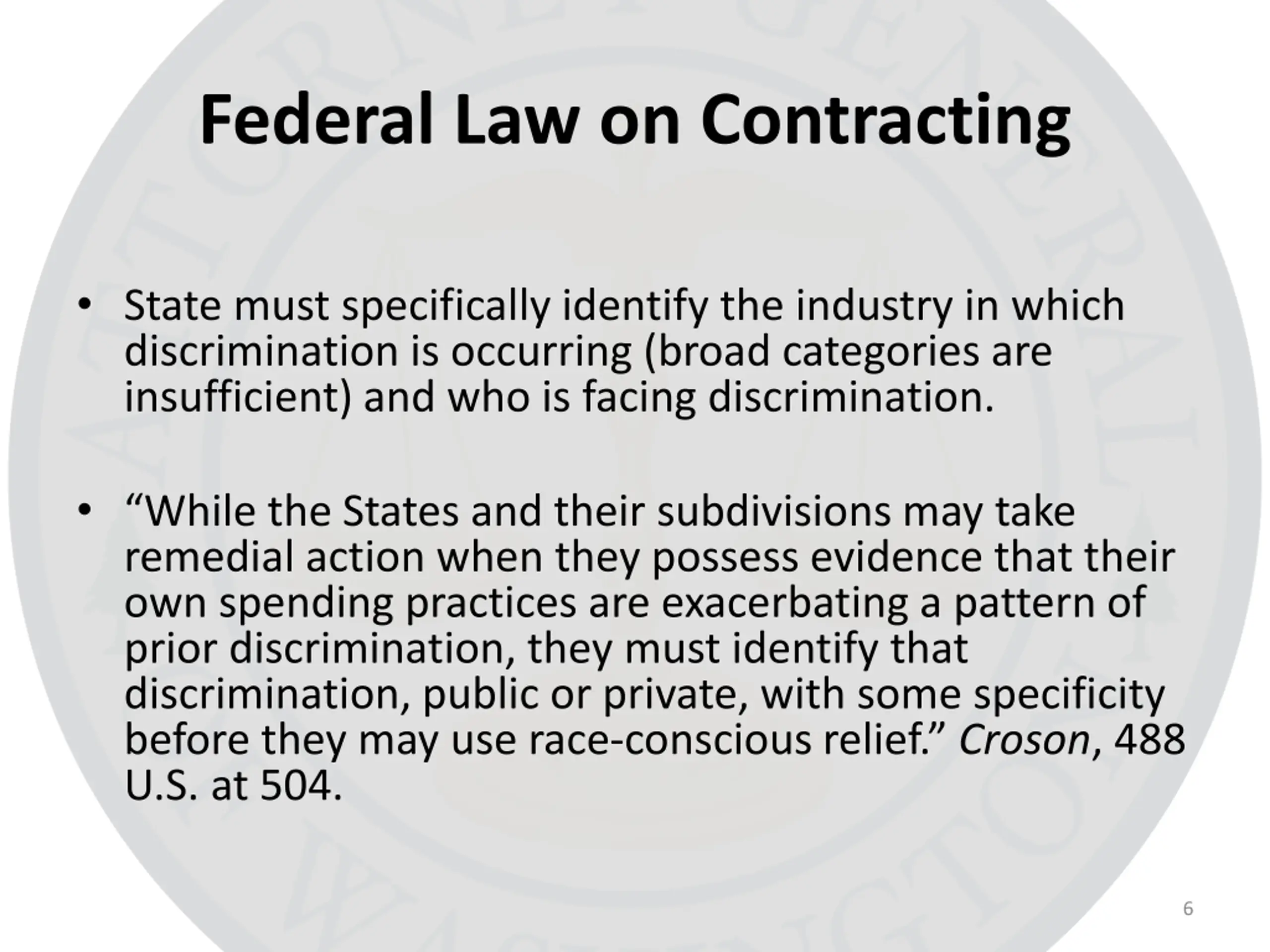 Federal Law on Contracting State must specifically identify the industry in which discrimination is occurring (broad categories are insufficient) and who is facing discrimination. While the States and their subdivisions may take remedial action when they possess evidence that their own spending practices are exacerbating a pattern of prior discrimination, they must identify that discrimination, public or private, with some specificity before they may use race-conscious relief. Croson, 488 U.S. at 504. 6