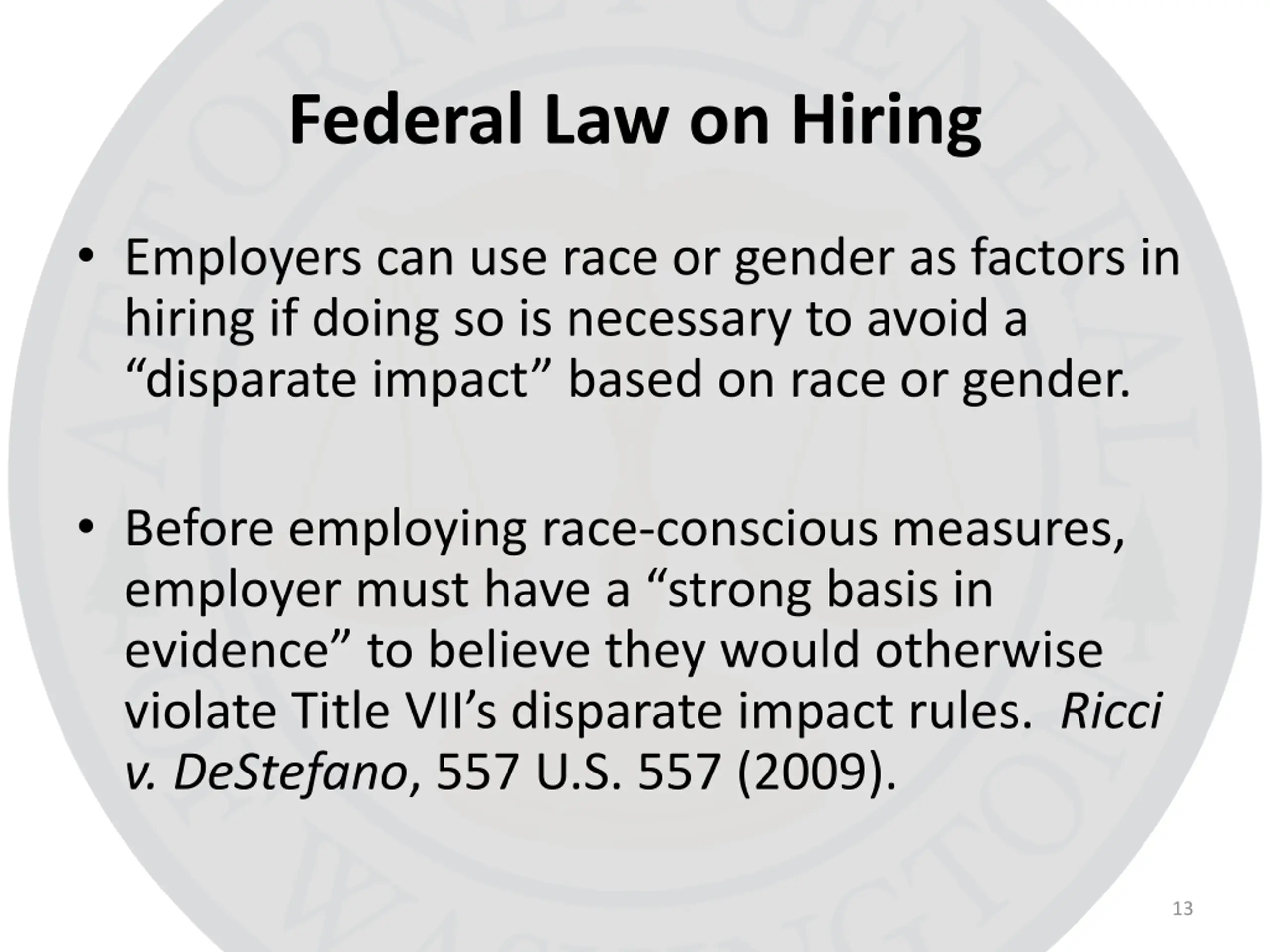 Federal Law on Hiring Employers can use race or gender as factors in hiring if doing so is necessary to avoid a disparate impact based on race or gender. Before employing race-conscious measures, employer must have a strong basis in evidence to believe they would otherwise violate Title VII s disparate impact rules. Ricci v. DeStefano, 557 U.S. 557 (2009). 13
