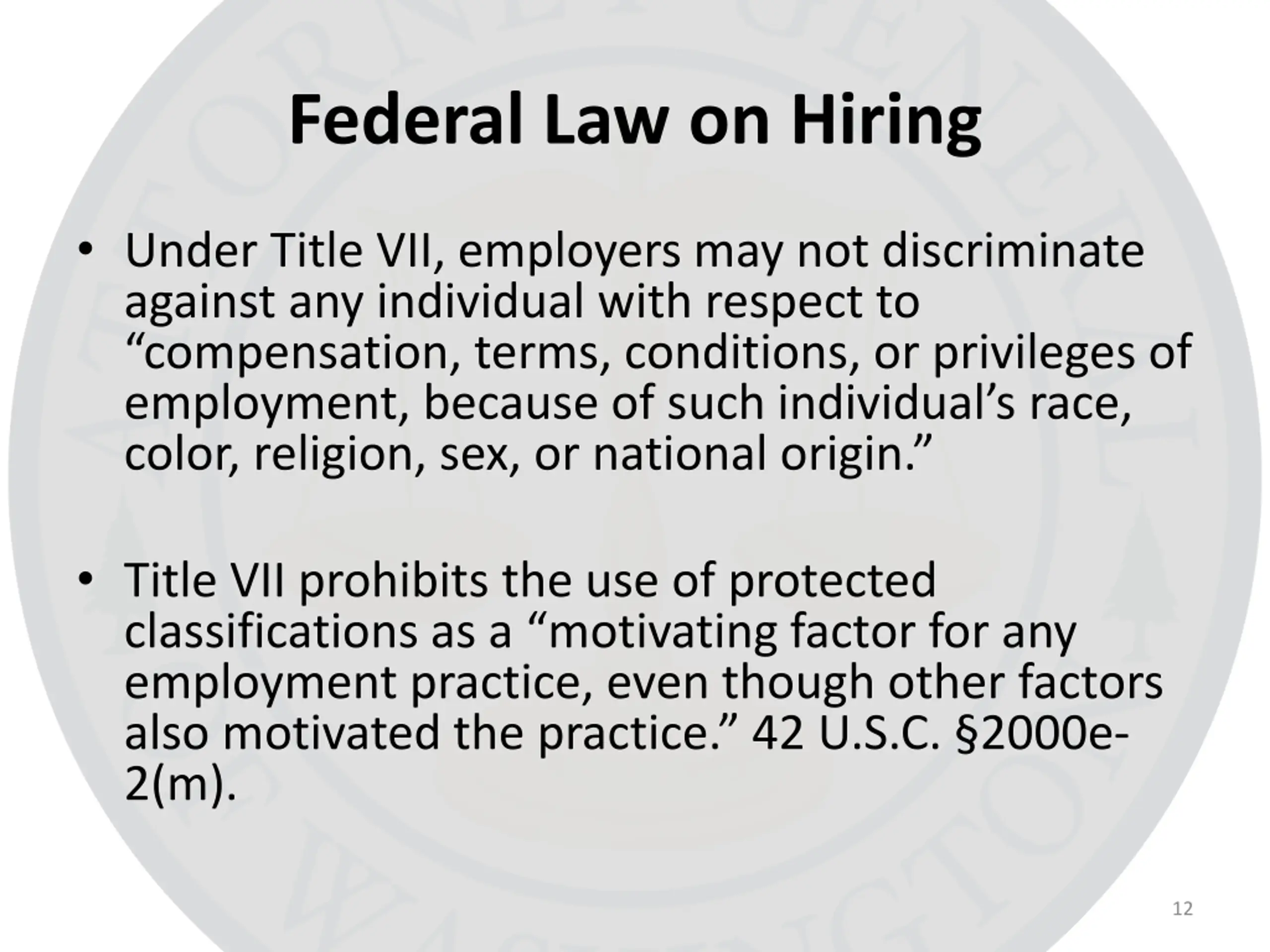 Federal Law on Hiring Under Title VII, employers may not discriminate against any individual with respect to compensation, terms, conditions, or privileges of employment, because of such individual s race, color, religion, sex, or national origin. Title VII prohibits the use of protected classifications as a motivating factor for any employment practice, even though other factors also motivated the practice. 42 U.S.C. 2000e- 2(m). 12