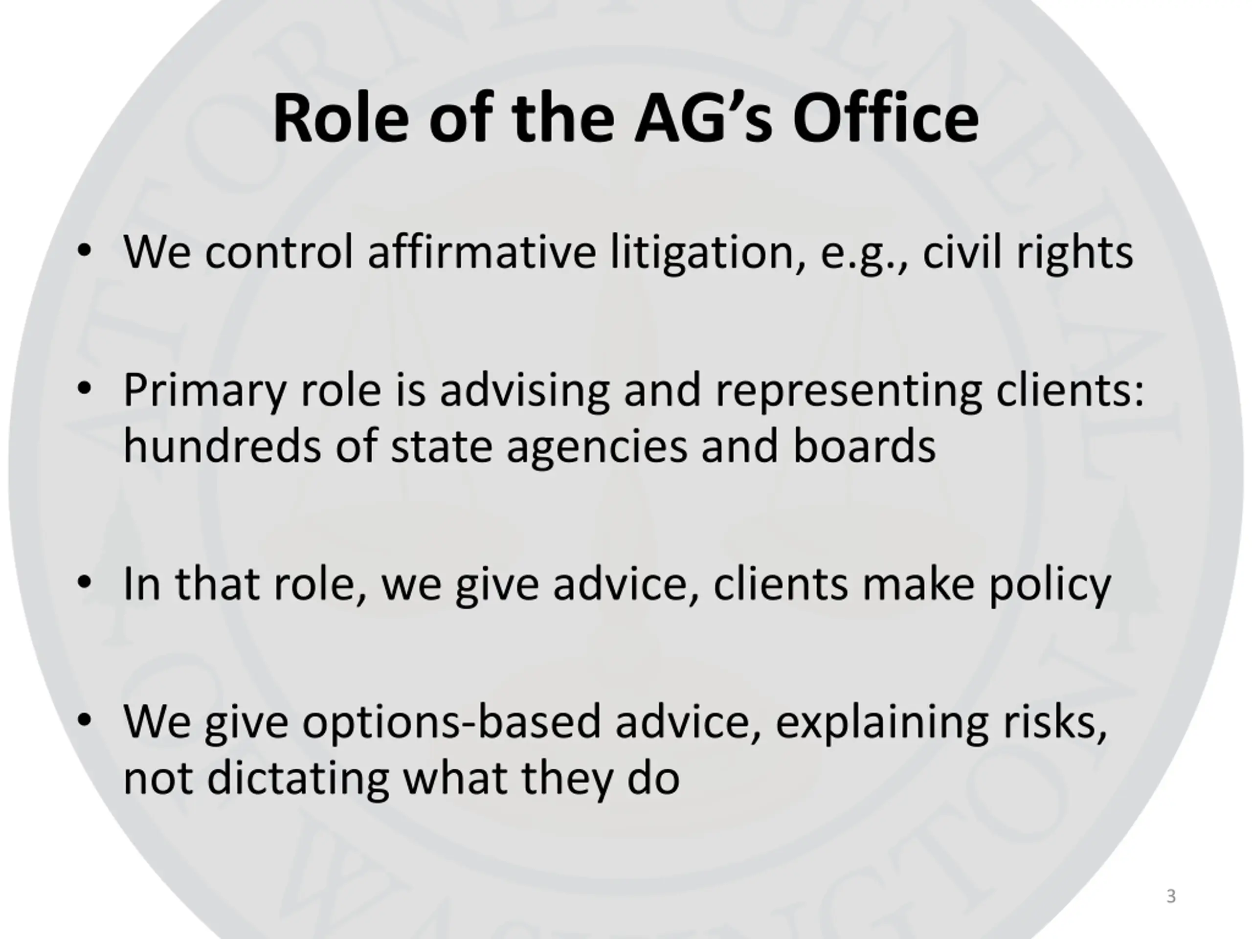 Role of the AGs Office We control affirmative litigation, e.g., civil rights Primary role is advising and representing clients: hundreds of state agencies and boards In that role, we give advice, clients make policy We give options-based advice, explaining risks, not dictating what they do 3