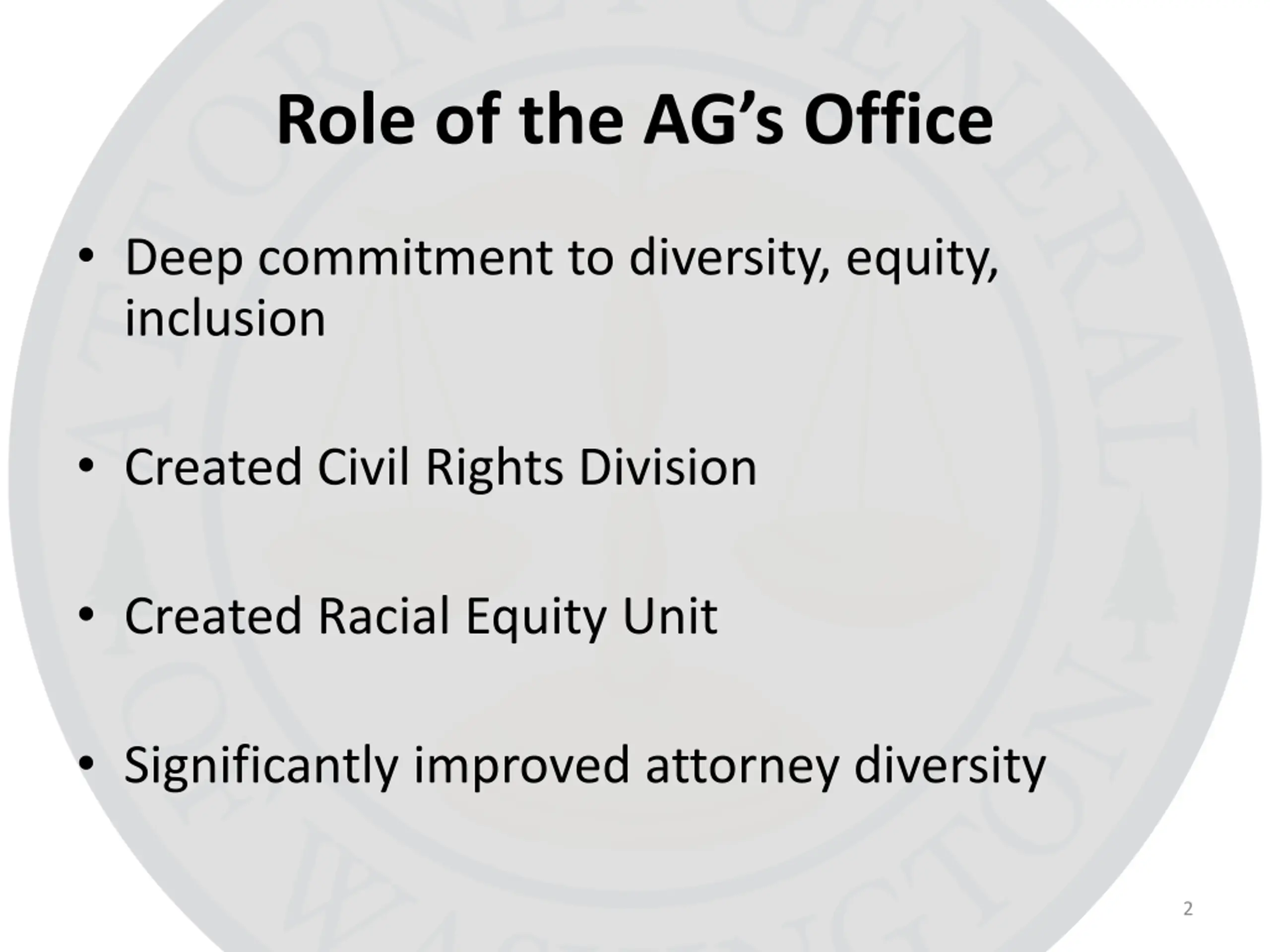 Role of the AGs Office Deep commitment to diversity, equity, inclusion Created Civil Rights Division Created Racial Equity Unit Significantly improved attorney diversity 2