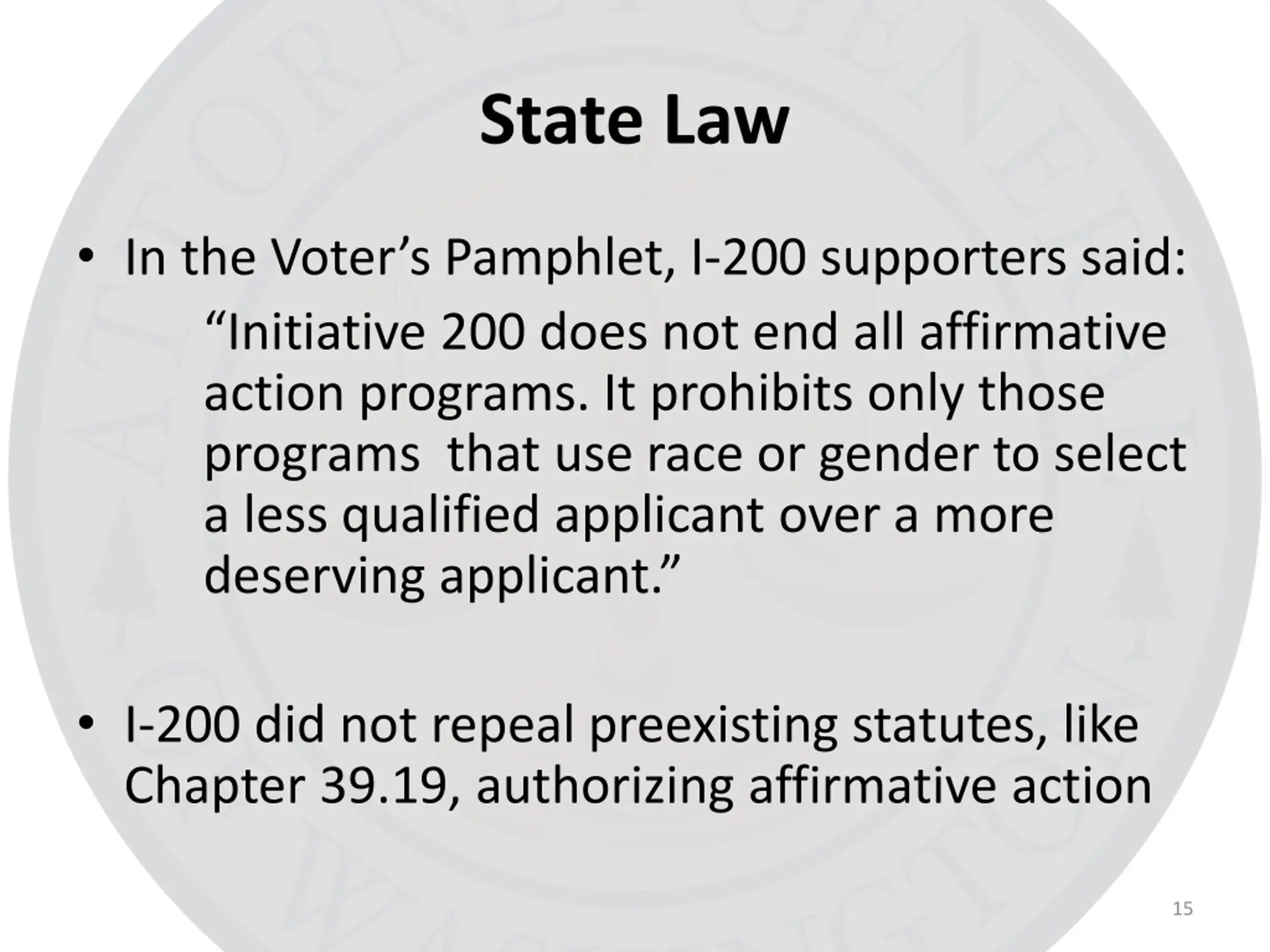 State Law In the Voter s Pamphlet, I-200 supporters said: Initiative 200 does not end all affirmative action programs. It prohibits only those programs that use race or gender to select a less qualified applicant over a more deserving applicant. I-200 did not repeal preexisting statutes, like Chapter 39.19, authorizing affirmative action 15