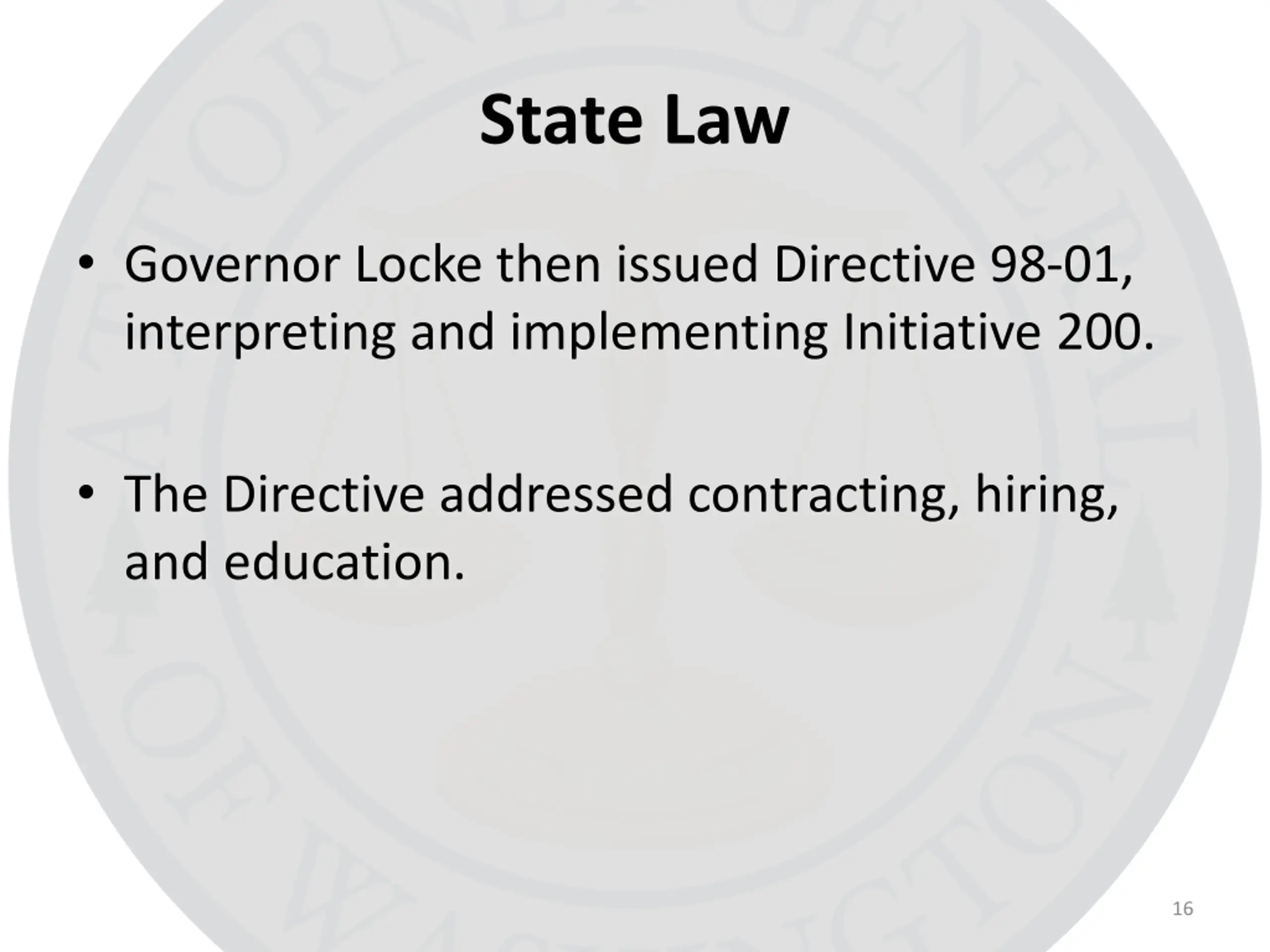 State Law Governor Locke then issued Directive 98-01, interpreting and implementing Initiative 200. The Directive addressed contracting, hiring, and education. 16