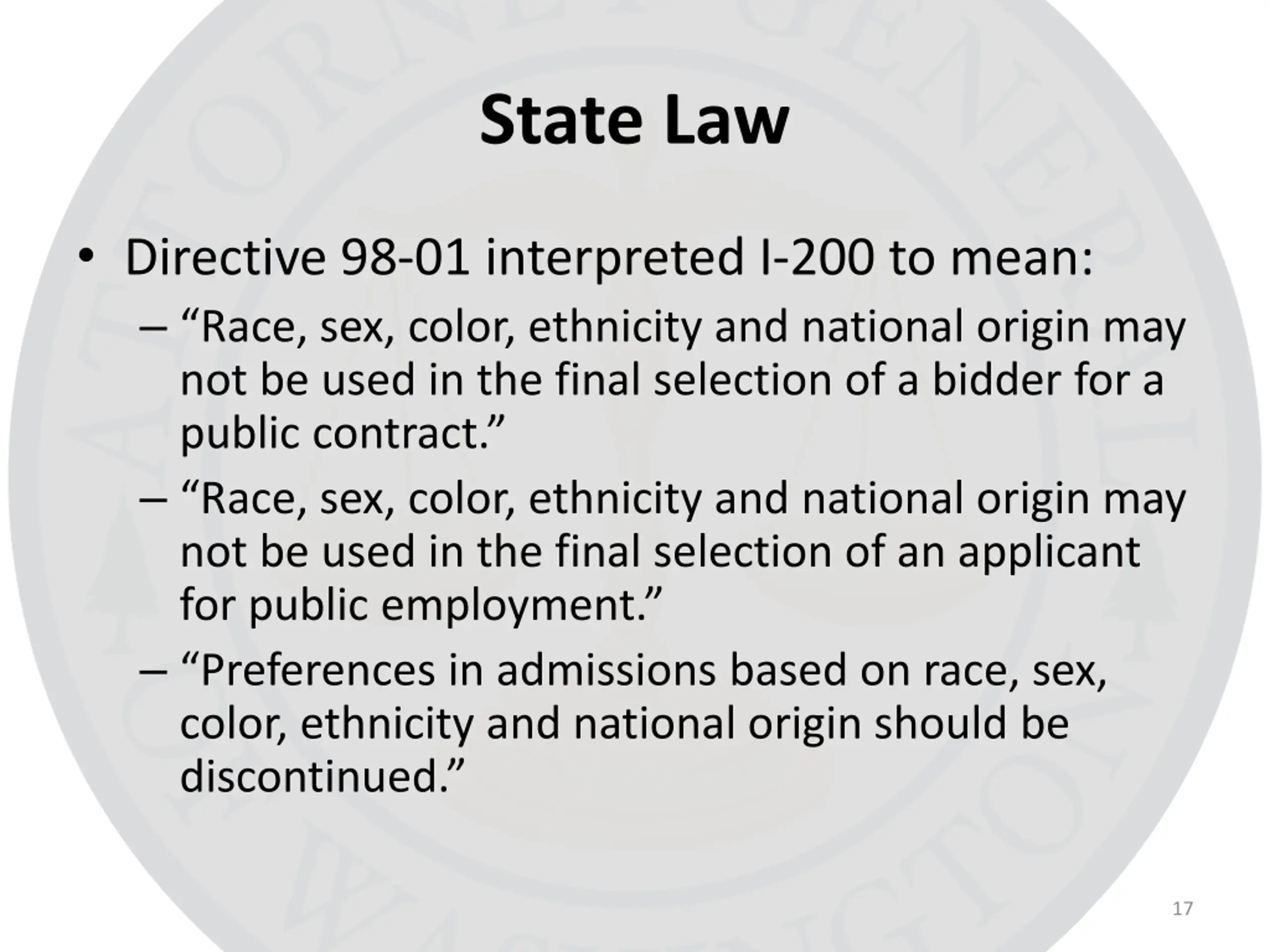 State Law Directive 98-01 interpreted I-200 to mean: Race, sex, color, ethnicity and national origin may not be used in the final selection of a bidder for a public contract. Race, sex, color, ethnicity and national origin may not be used in the final selection of an applicant for public employment. Preferences in admissions based on race, sex, color, ethnicity and national origin should be discontinued. 17