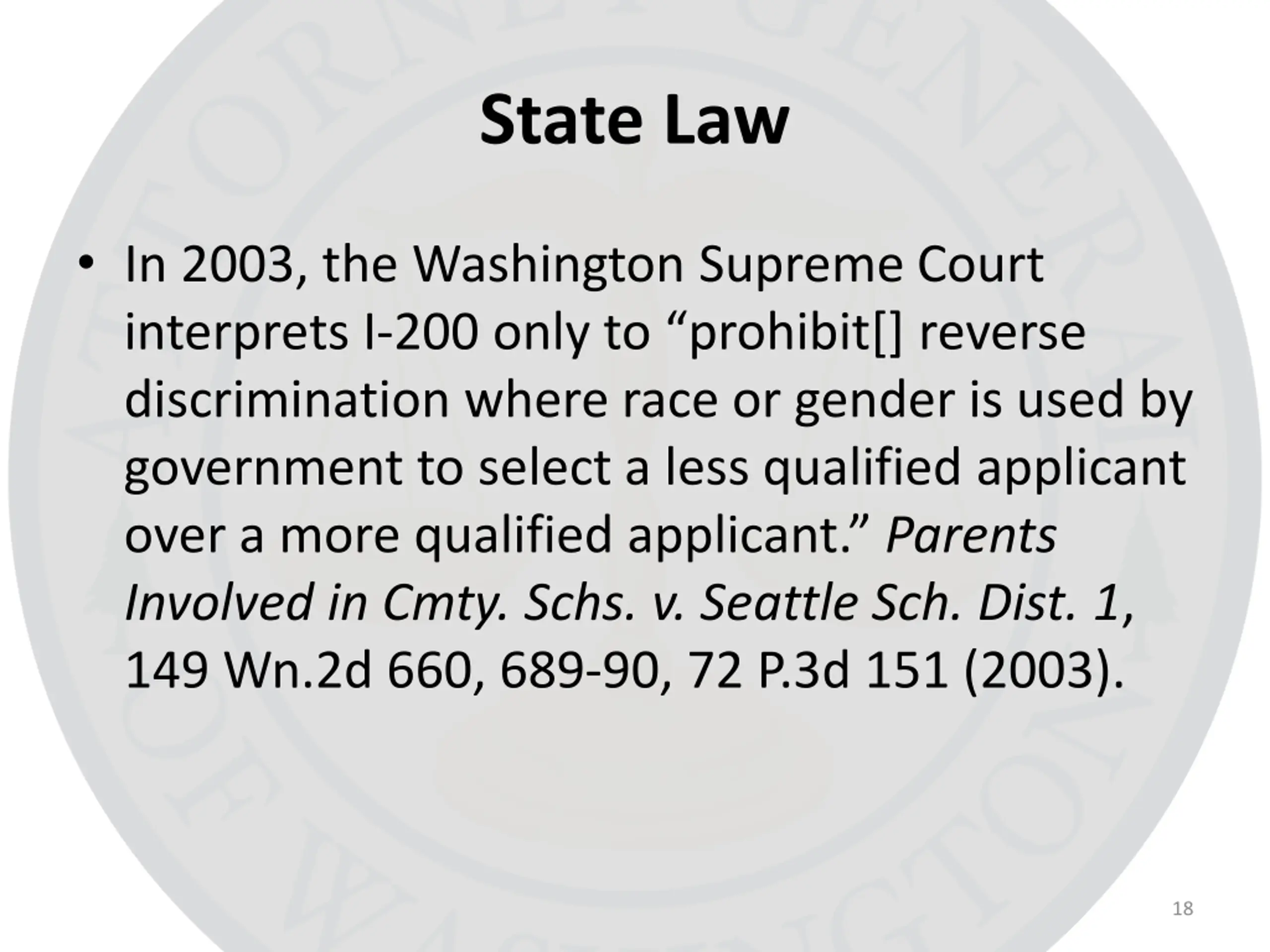 State Law In 2003, the Washington Supreme Court interprets I-200 only to prohibit[] reverse discrimination where race or gender is used by government to select a less qualified applicant over a more qualified applicant. Parents Involved in Cmty. Schs. v. Seattle Sch. Dist. 1, 149 Wn.2d 660, 689-90, 72 P.3d 151 (2003). 18