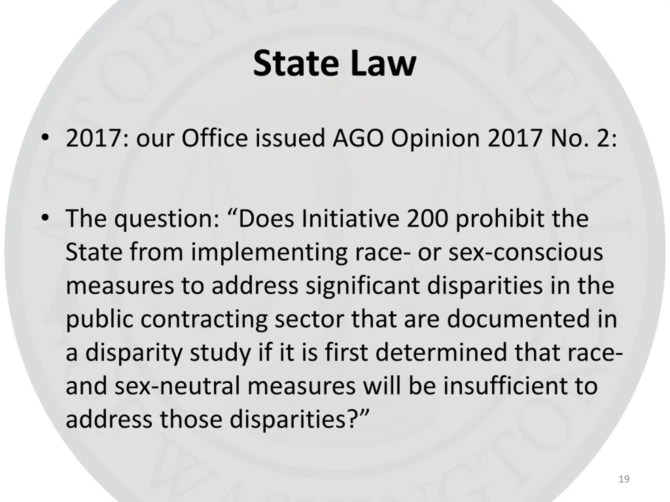 State Law 2017: our Office issued AGO Opinion 2017 No. 2: The question: Does Initiative 200 prohibit the State from implementing race- or sex-conscious measures to address significant disparities in the public contracting sector that are documented in a disparity study if it is first determined that race- and sex-neutral measures will be insufficient to address those disparities? 19