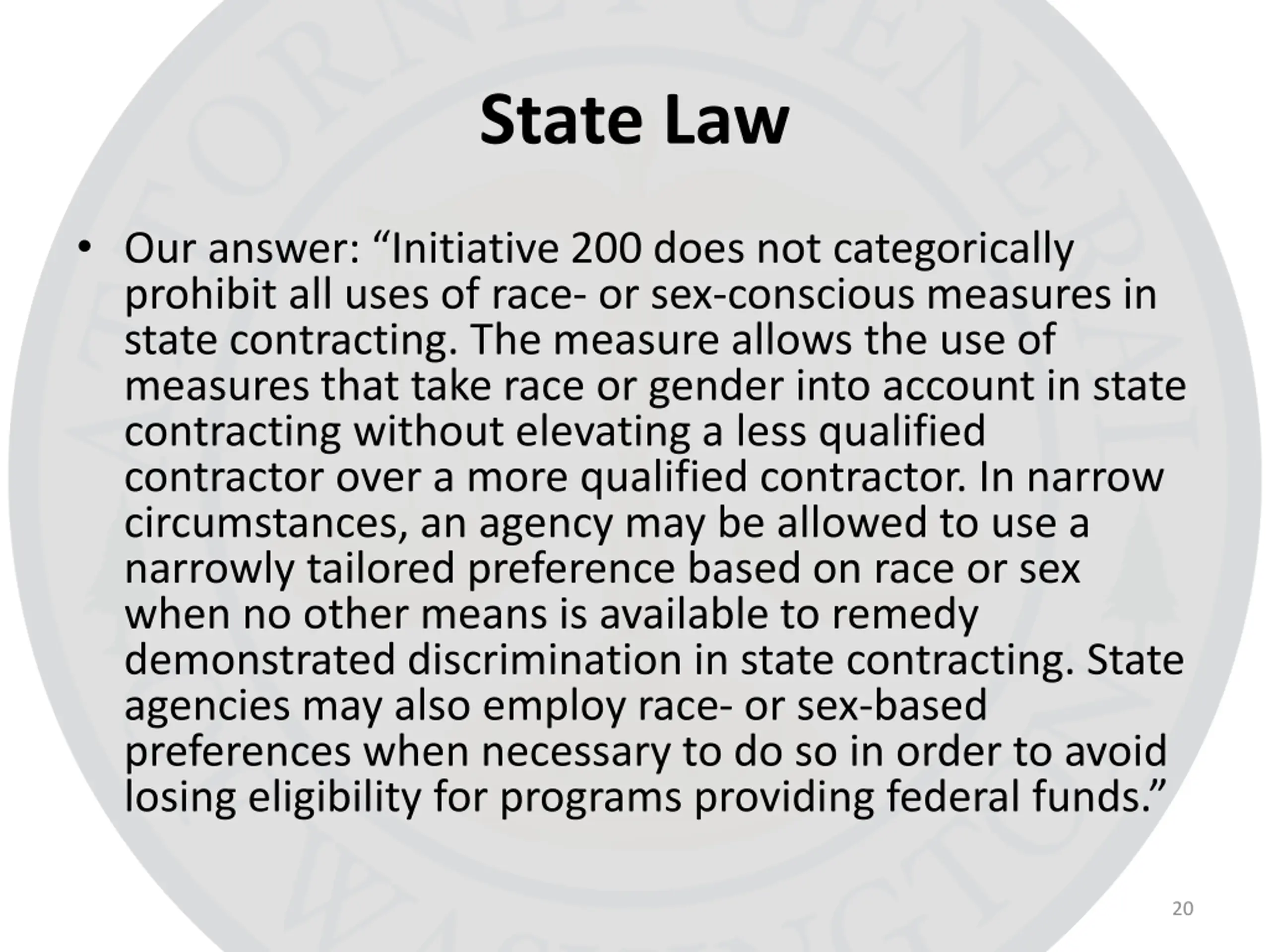 State Law Our answer: Initiative 200 does not categorically prohibit all uses of race- or sex-conscious measures in state contracting. The measure allows the use of measures that take race or gender into account in state contracting without elevating a less qualified contractor over a more qualified contractor. In narrow circumstances, an agency may be allowed to use a narrowly tailored preference based on race or sex when no other means is available to remedy demonstrated discrimination in state contracting. State agencies may also employ race- or sex-based preferences when necessary to do so in order to avoid losing eligibility for programs providing federal funds. 20
