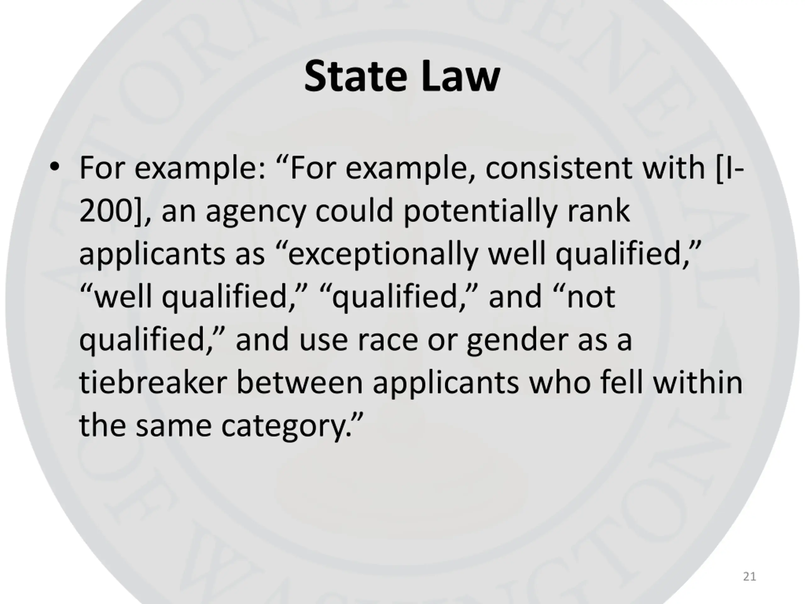 State Law For example: For example, consistent with [I- 200], an agency could potentially rank applicants as exceptionally well qualified, well qualified, qualified, and not qualified, and use race or gender as a tiebreaker between applicants who fell within the same category. 21