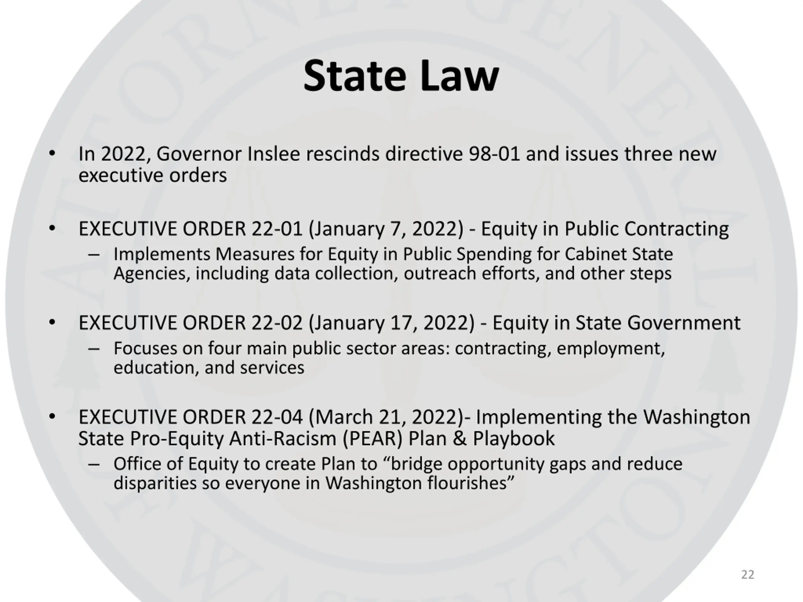 State Law In 2022, Governor Inslee rescinds directive 98-01 and issues three new executive orders EXECUTIVE ORDER 22-01 (January 7, 2022) - Equity in Public Contracting Implements Measures for Equity in Public Spending for Cabinet State Agencies, including data collection, outreach efforts, and other steps EXECUTIVE ORDER 22-02 (January 17, 2022) - Equity in State Government Focuses on four main public sector areas: contracting, employment, education, and services EXECUTIVE ORDER 22-04 (March 21, 2022)- Implementing the Washington State Pro-Equity Anti-Racism (PEAR) Plan & Playbook Office of Equity to create Plan to bridge opportunity gaps and reduce disparities so everyone in Washington flourishes 22
