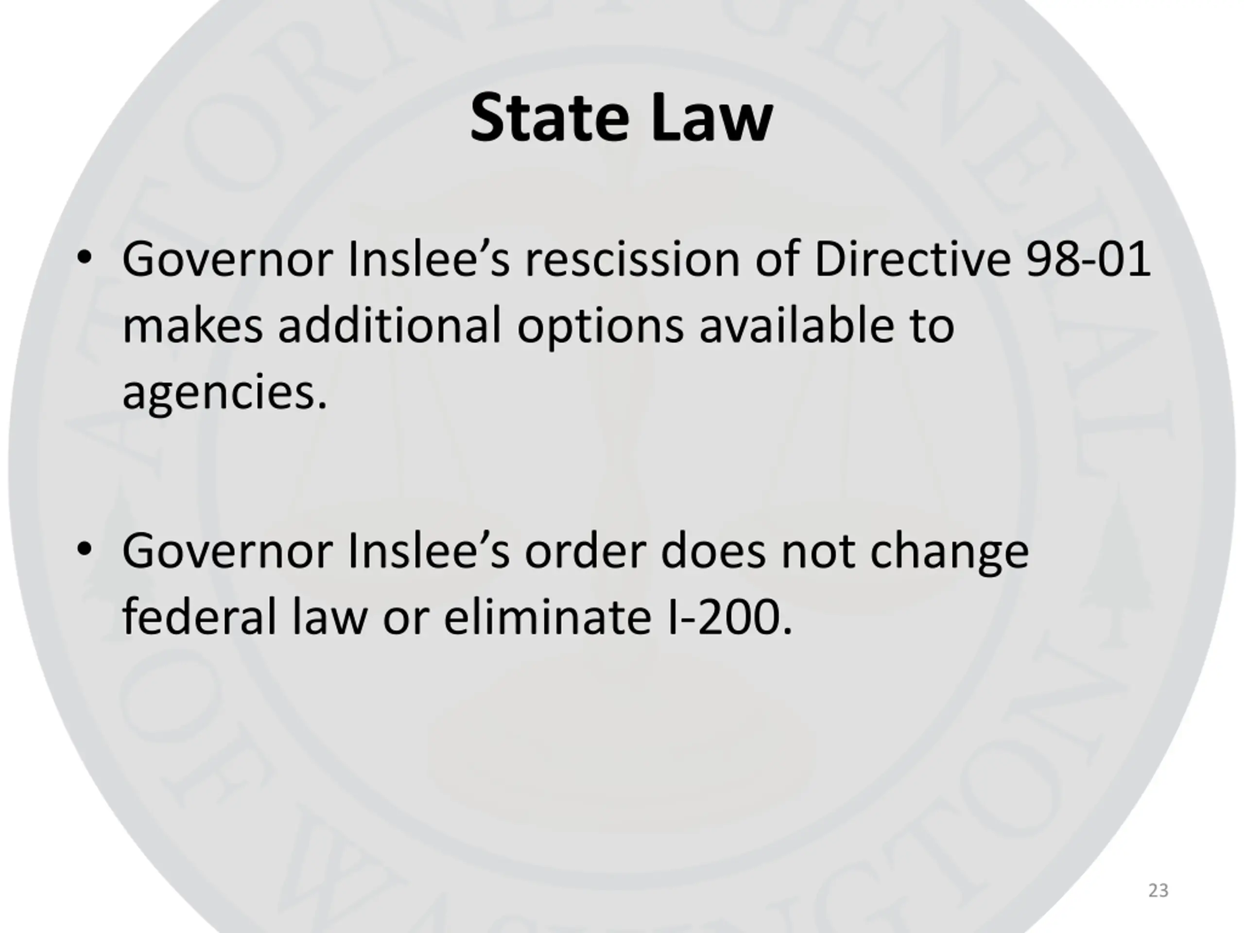 State Law Governor Inslee s rescission of Directive 98-01 makes additional options available to agencies. Governor Inslee s order does not change federal law or eliminate I-200. 23